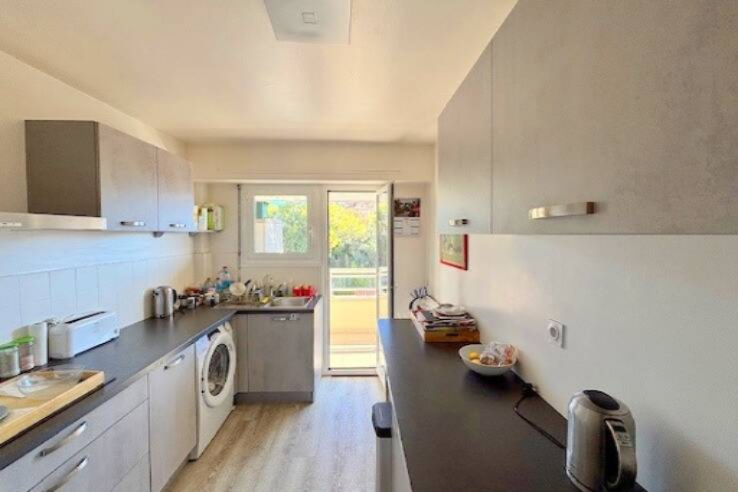 Предлагается на последнем этаже резиденции с консьержем, в районе нижний Petit Juas, в нескольких минутах пешком от вокзала и дворца фестивалей, сквозная квартира, ориентированная на восток и запад, с открытым видом, светлая, площадью 62,15 м². Включает прихожую, гостиную, террасу 11 м², отдельную кухню с балконом на восток площадью 7,35 м², две большие спальни, ванную комнату и отдельный туалет. Подвал и гараж.