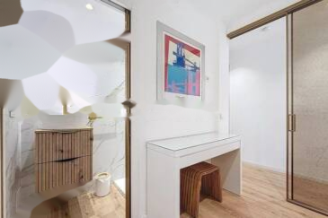Апартамент состоит из прихожей, светлой гостиной с открытой кухней, двух спален, каждая из которых имеет свою душевую, одна из которых с туалетом, и отдельного туалета. ️