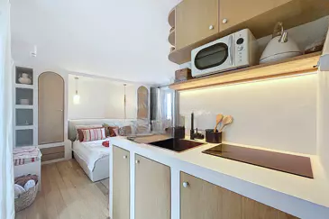 В ней вы найдете полностью оборудованную кухню открытого типа, жилое пространство с местами для хранения и смежную душевую комнату. Благодаря широким окнам и высокой позиции над уровнем улицы, вы сможете насладиться прекрасным видом на море и старый порт.