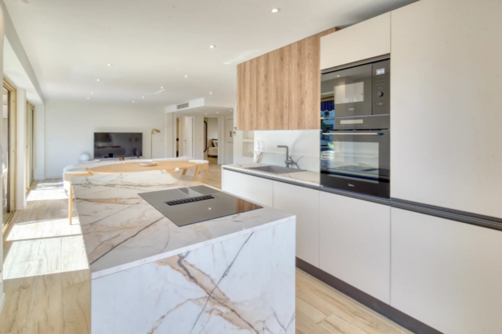 Интерьер, пронизанный естественным светом, раскрывает просторную гостиную с обеденной зоной, открывающуюся на современную, полностью оборудованную кухню. Все выходят на приятную террасу, идеальную для отдыха или обедов на свежем воздухе.