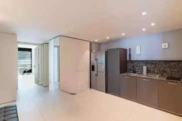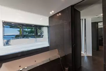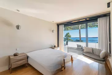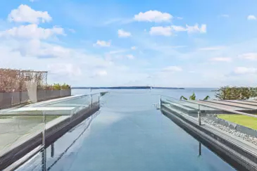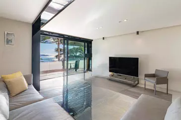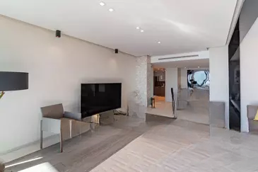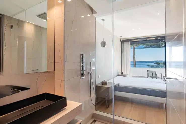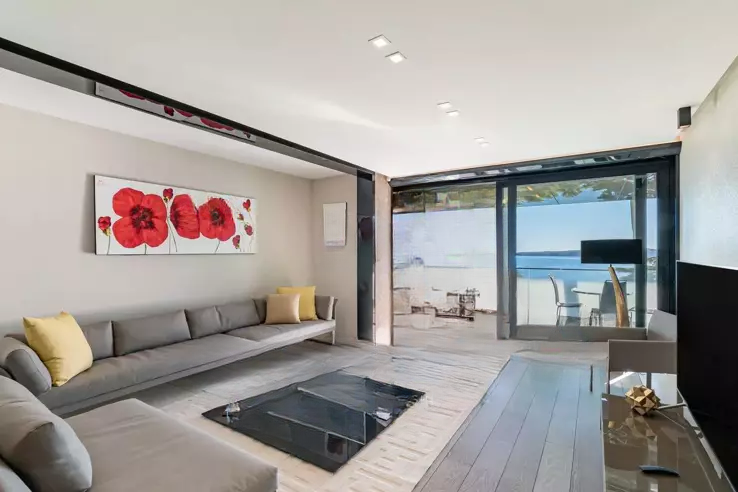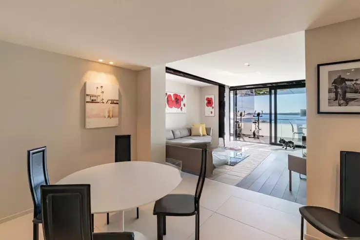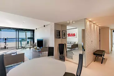 Квартира с большими пространствами и современным декором включает в себя прихожую, кухонную зону, гостиную с выходом на террасу площадью 42 м² с видом на море, а также две спальни с ванными комнатами.