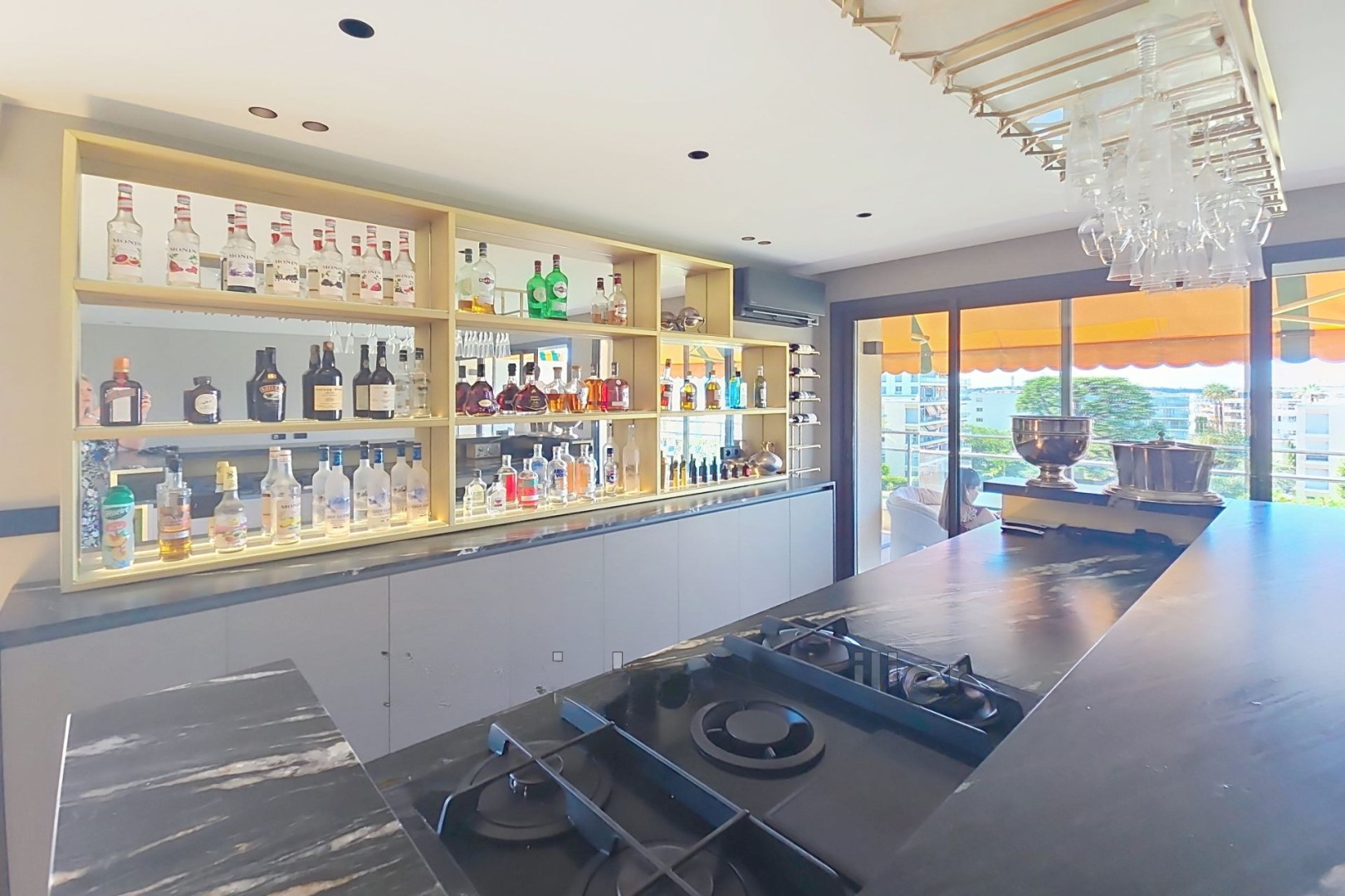 Светлая гостиная открывается на террасу площадью 25 м² с панорамным видом на море и Леринские острова, в то время как кухня в нью-йоркском стиле придаёт роскошь пространству.