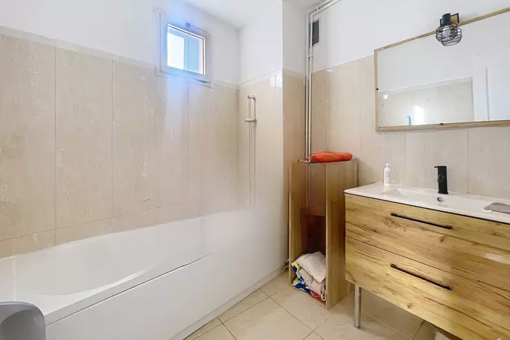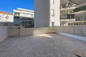 Эксклюзивно: В центре города ваше агентство предлагает эту очень большую двухкомнатную квартиру площадью около 59 м², расположенную на первом этаже с южной стороны и на уровне земли над гаражами с северной стороны. Она состоит из: прихожей, просторной кухни/гостиной с выходом на террасу 25 м² на северной стороне, ванной комнаты, отдельного туалета и спальни с балконом на южной стороне.
