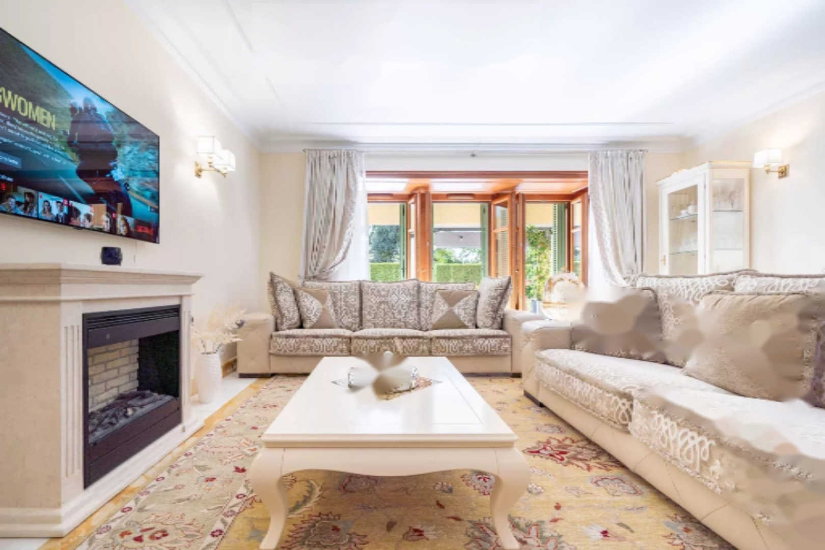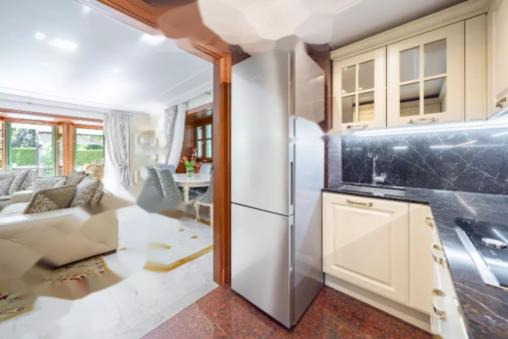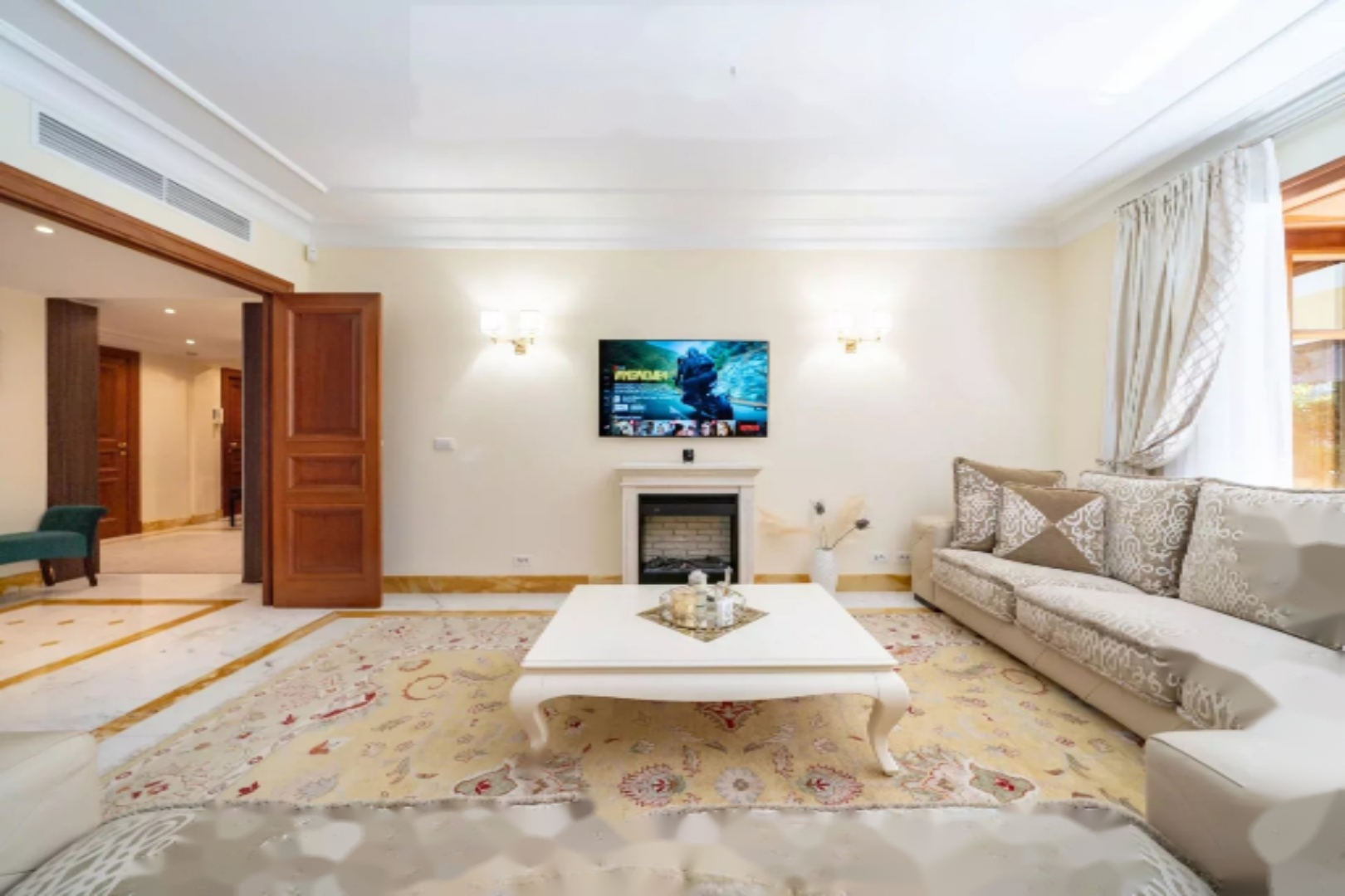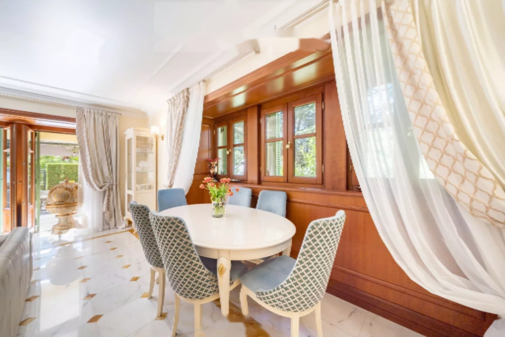 Гостиная выходит на великолепную полузакрытую террасу, обращенную на юг, где расположена летняя кухня, предоставляющая абсолютную тишину и частный выход в парк комплекса.