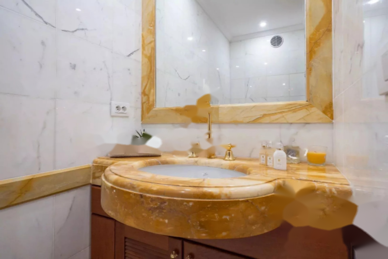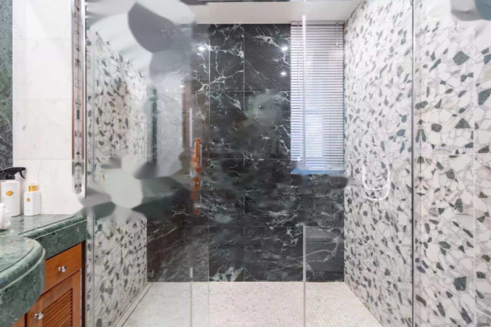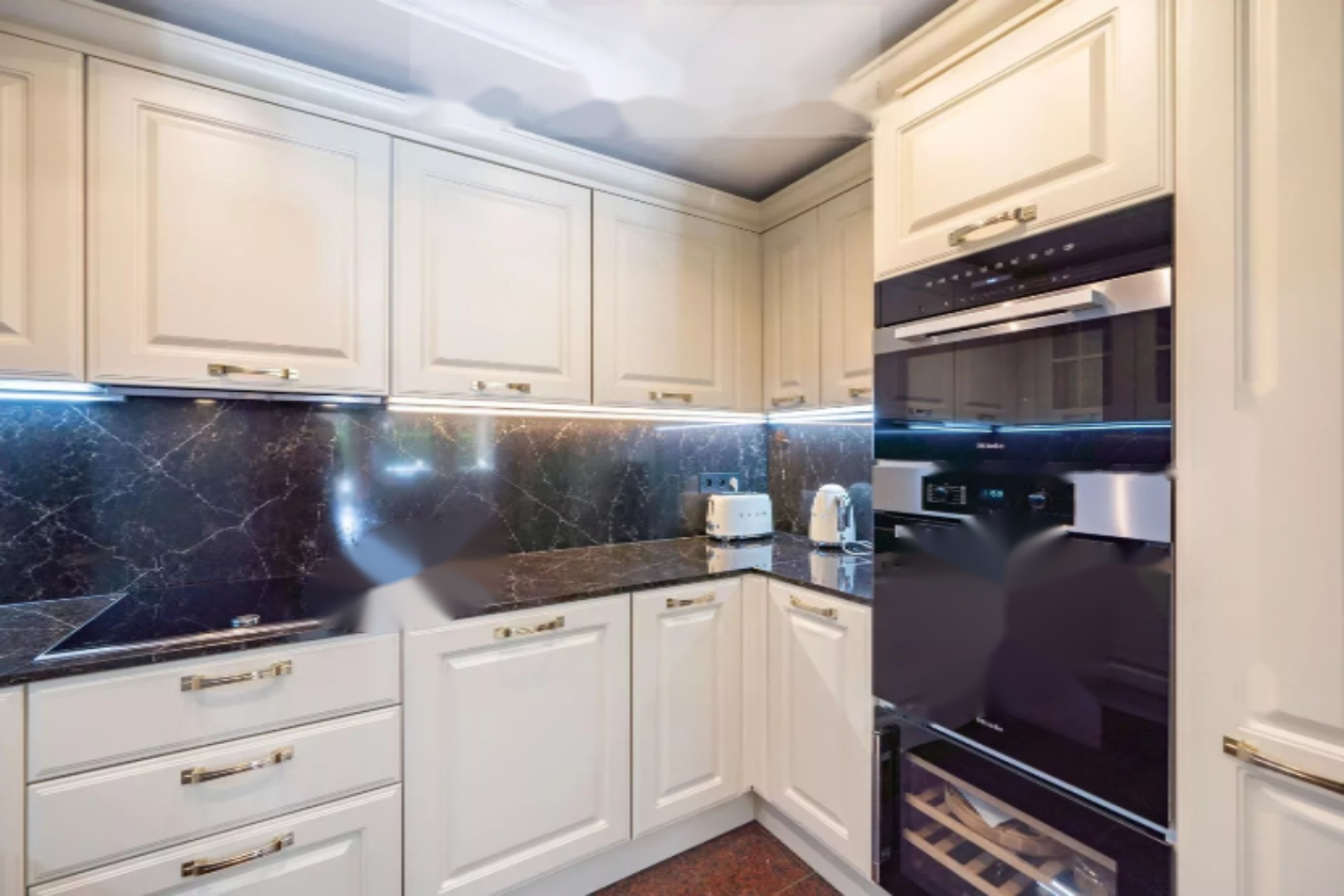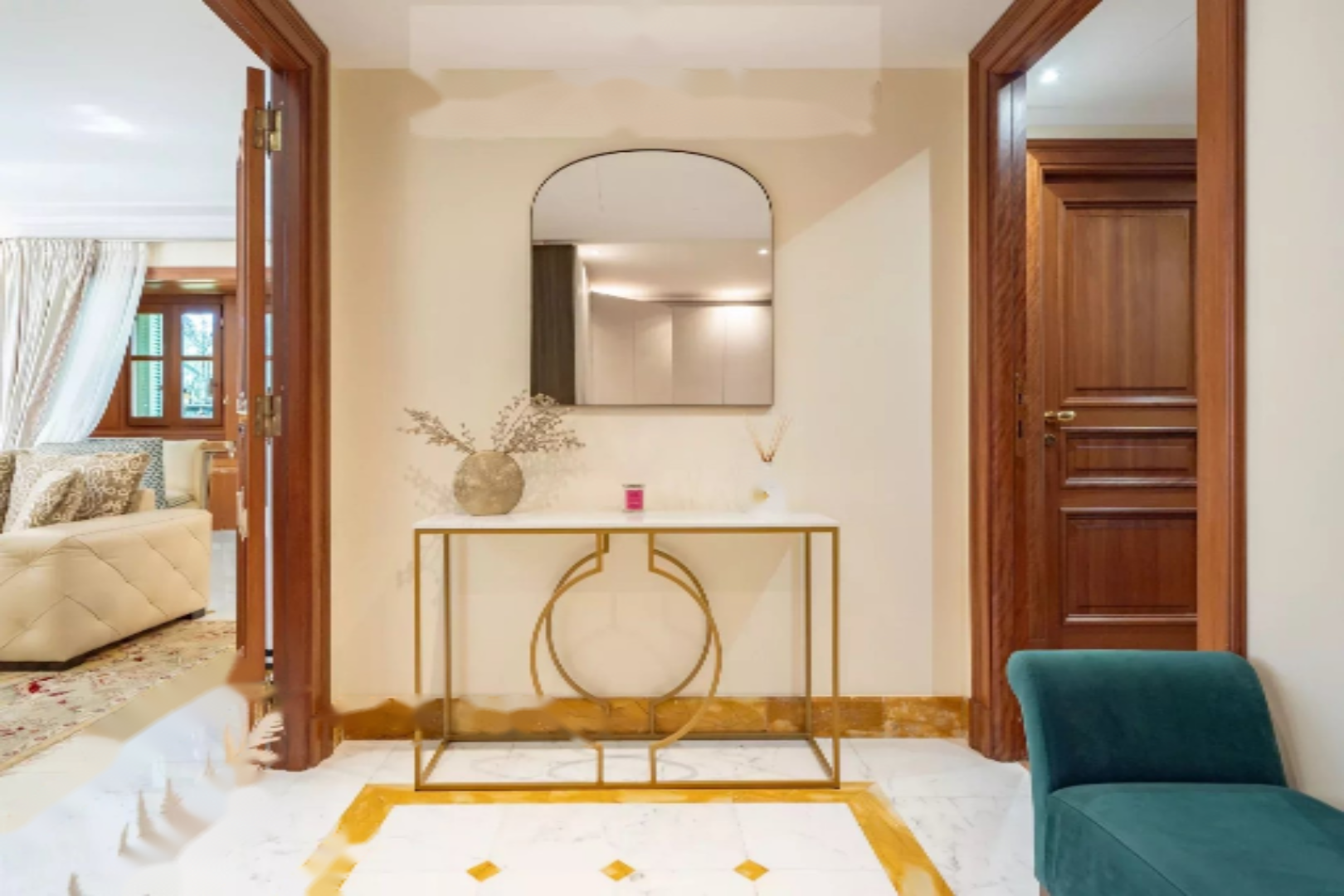 Апартаменты включают просторный вестибюль, гостиную, полуоткрытую кухню, две спальни с ванными комнатами, множество гардеробов и мест для хранения, прачечную и гостевой туалет.