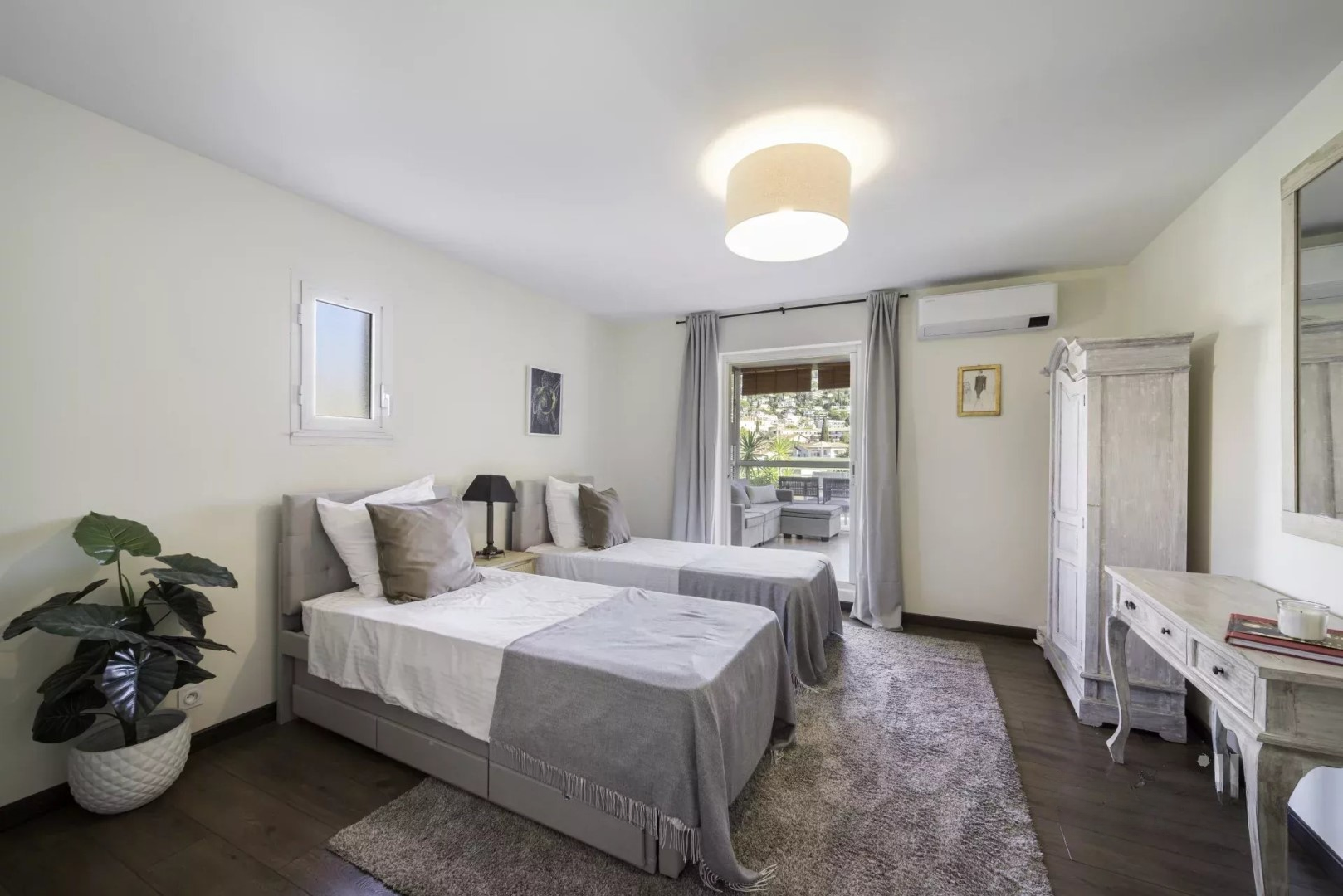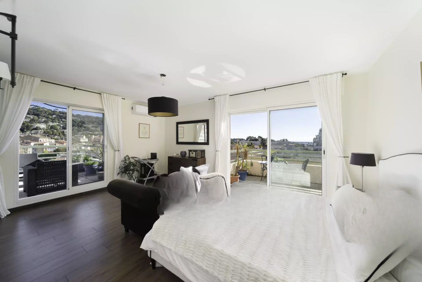 На верхнем уровне: две спальни-люкс, каждая с ванной комнатой и гардеробной, выходящие на большую террасу с приятным видом на море и холмы.