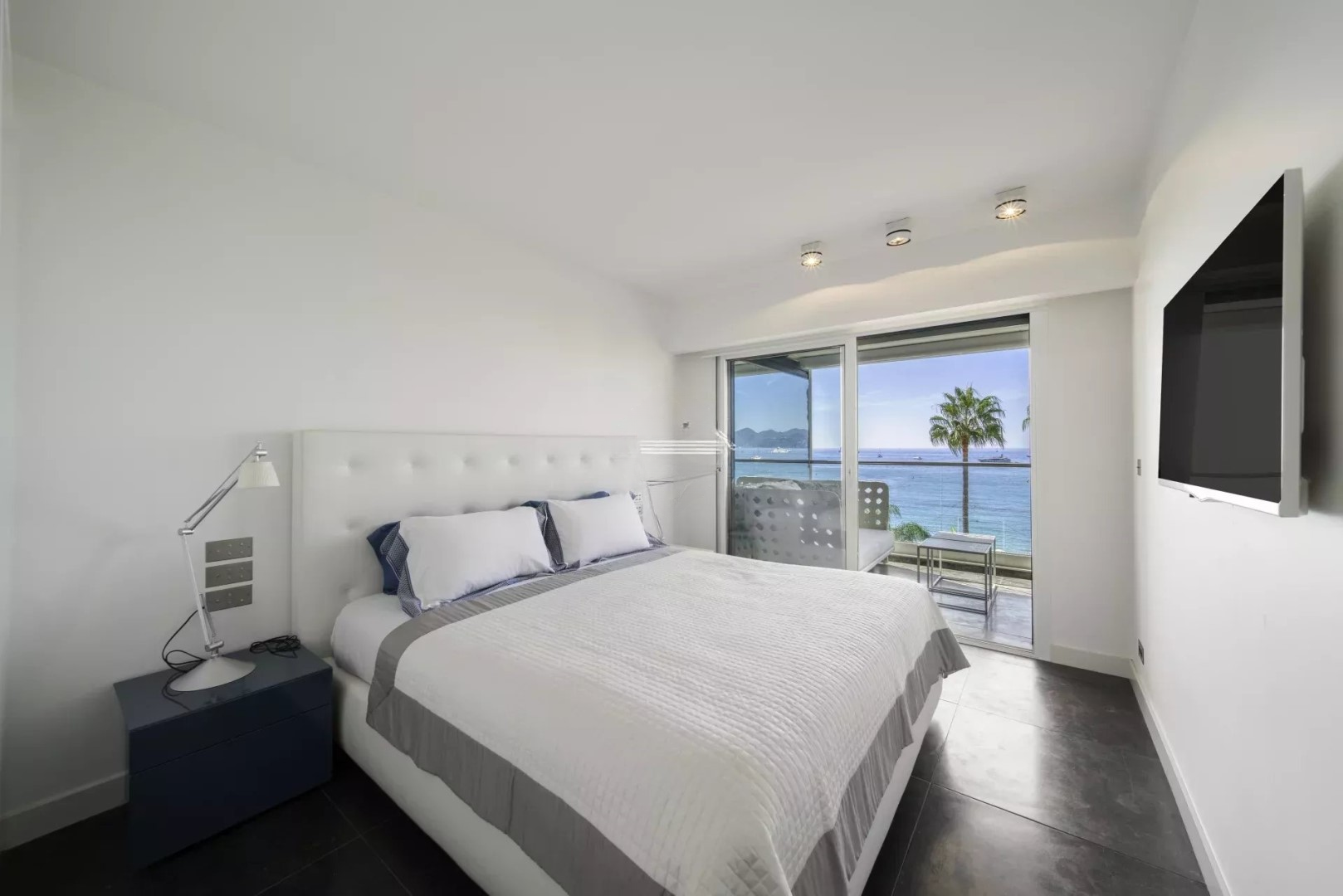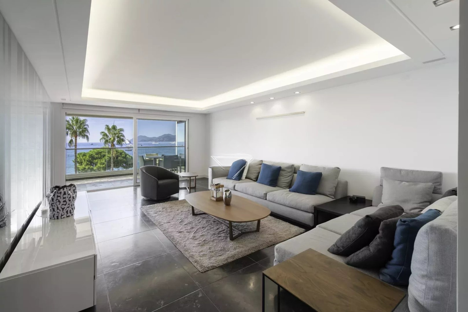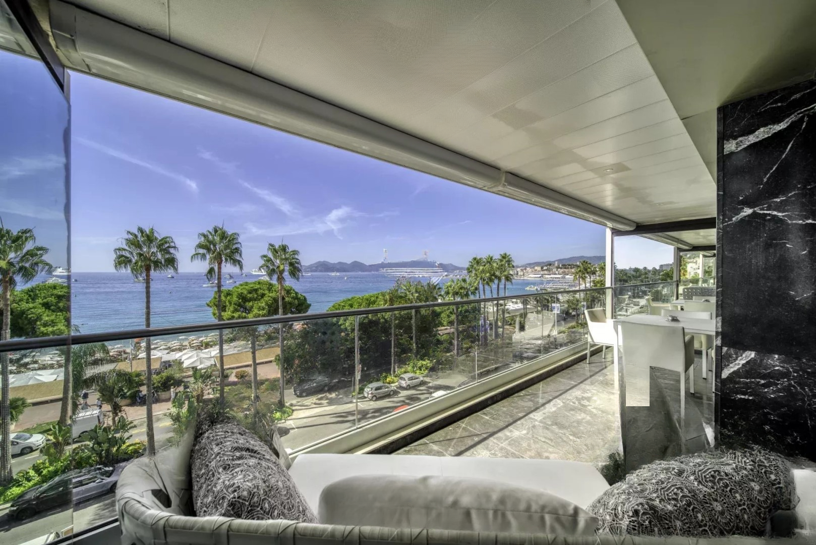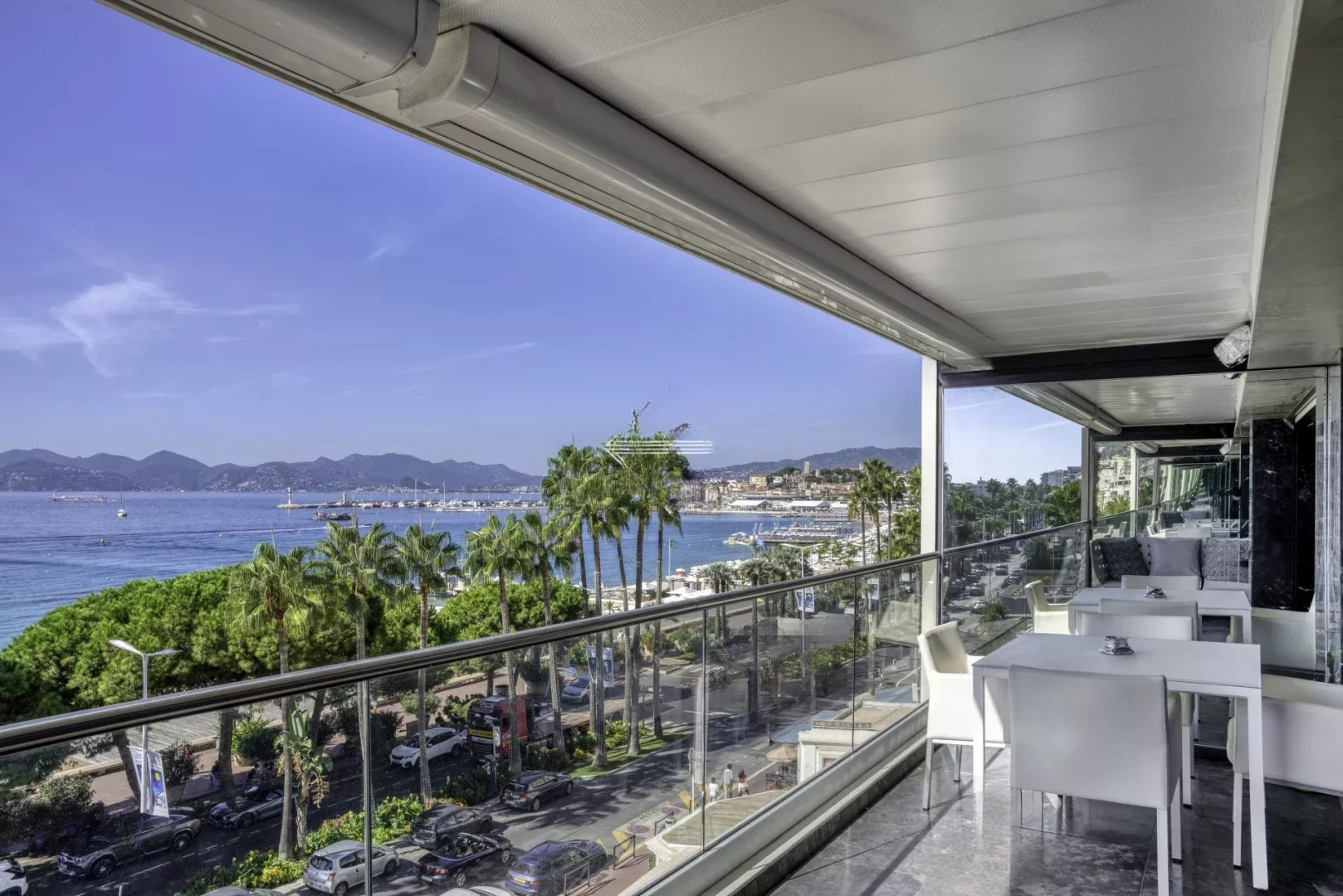 Полностью обновленный с высококачественными услугами, этот элегантный апартамент площадью около 85 м² обладает потрясающим панорамным видом на море и залив Канн.