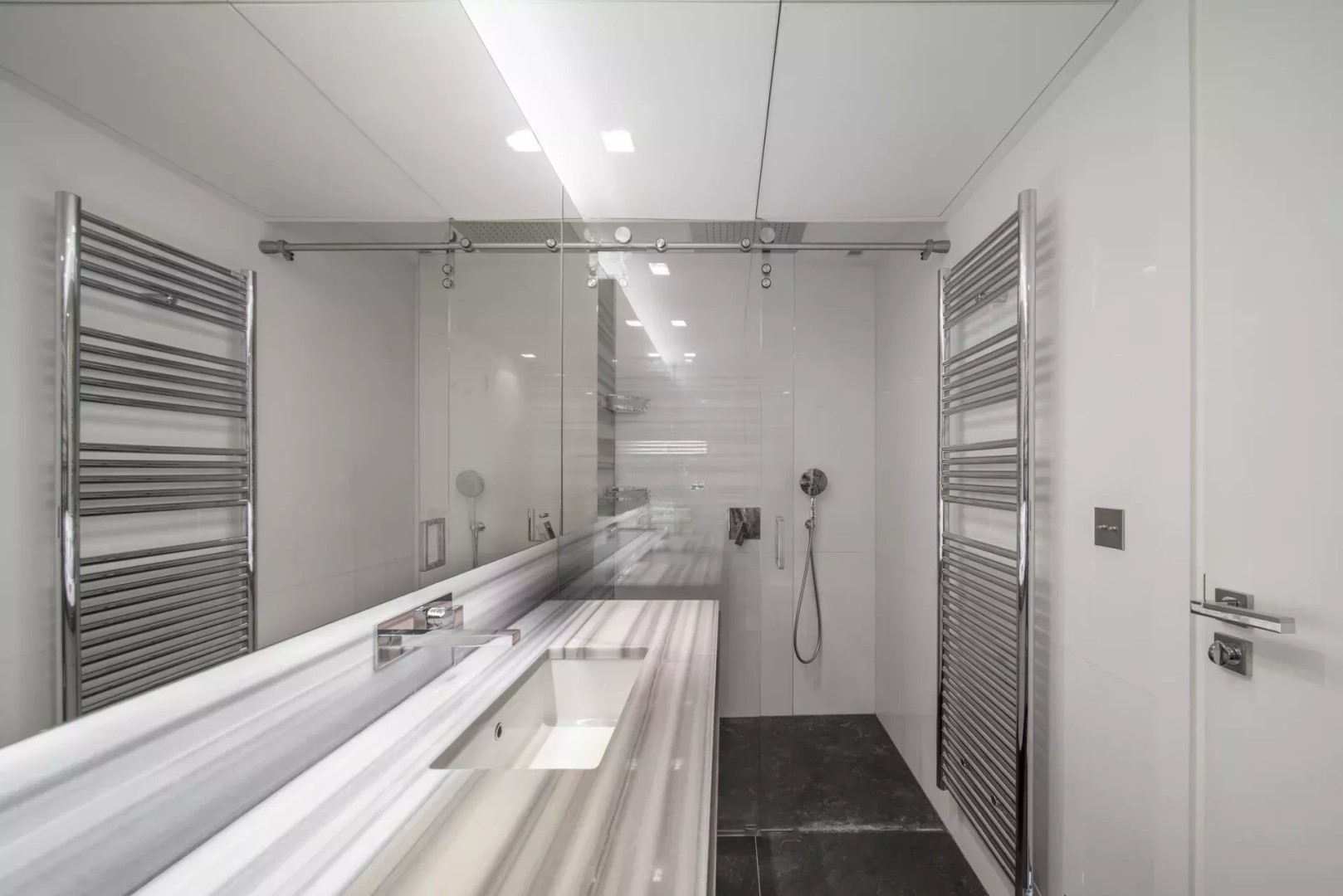 Главная спальня имеет прямой выход на южную террасу с исключительным видом на море и ванную комнату с душем. Вторая спальня выходит на северную террасу и также имеет ванную комнату с душем. Гостевой туалет завершает это гармоничное расположение.