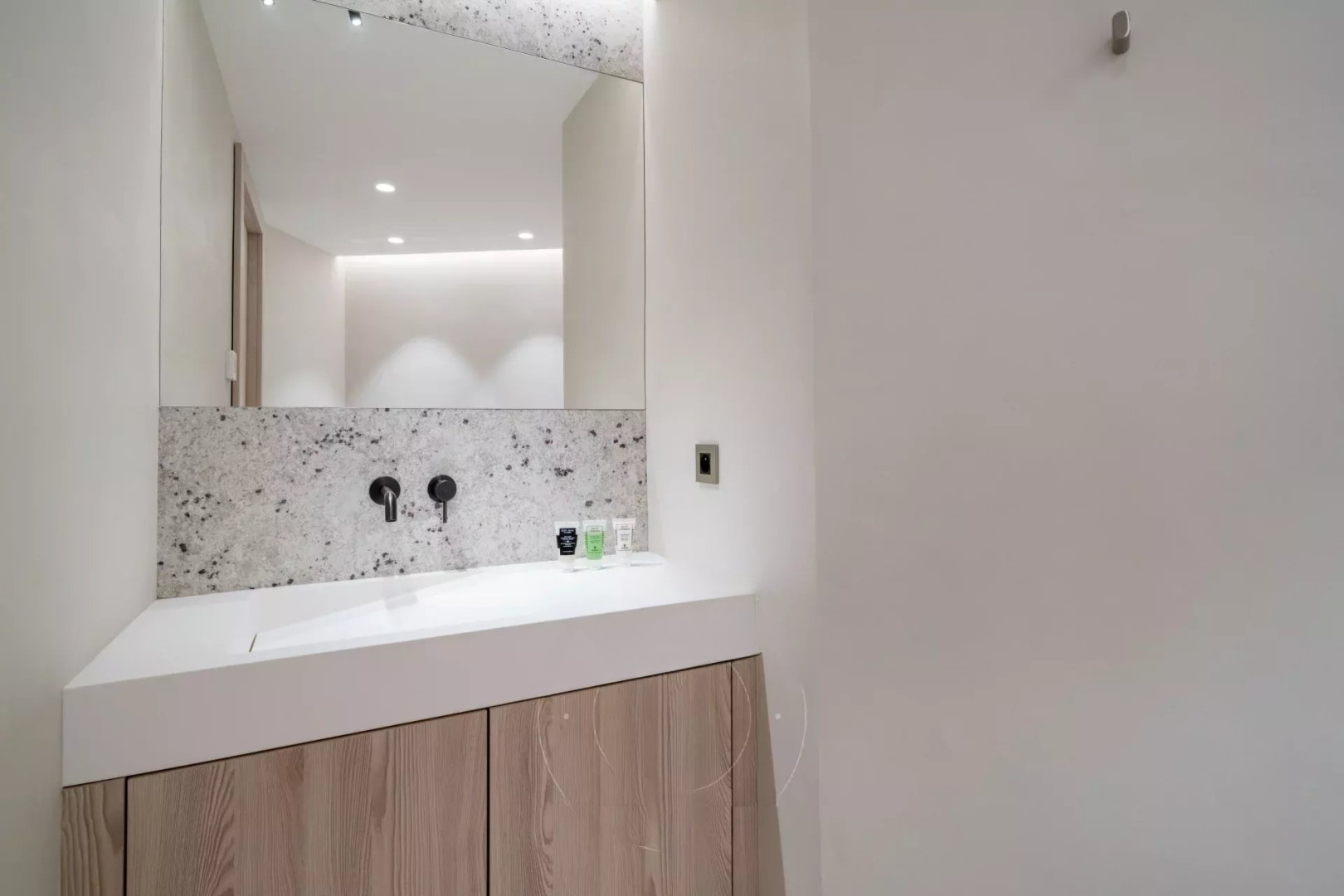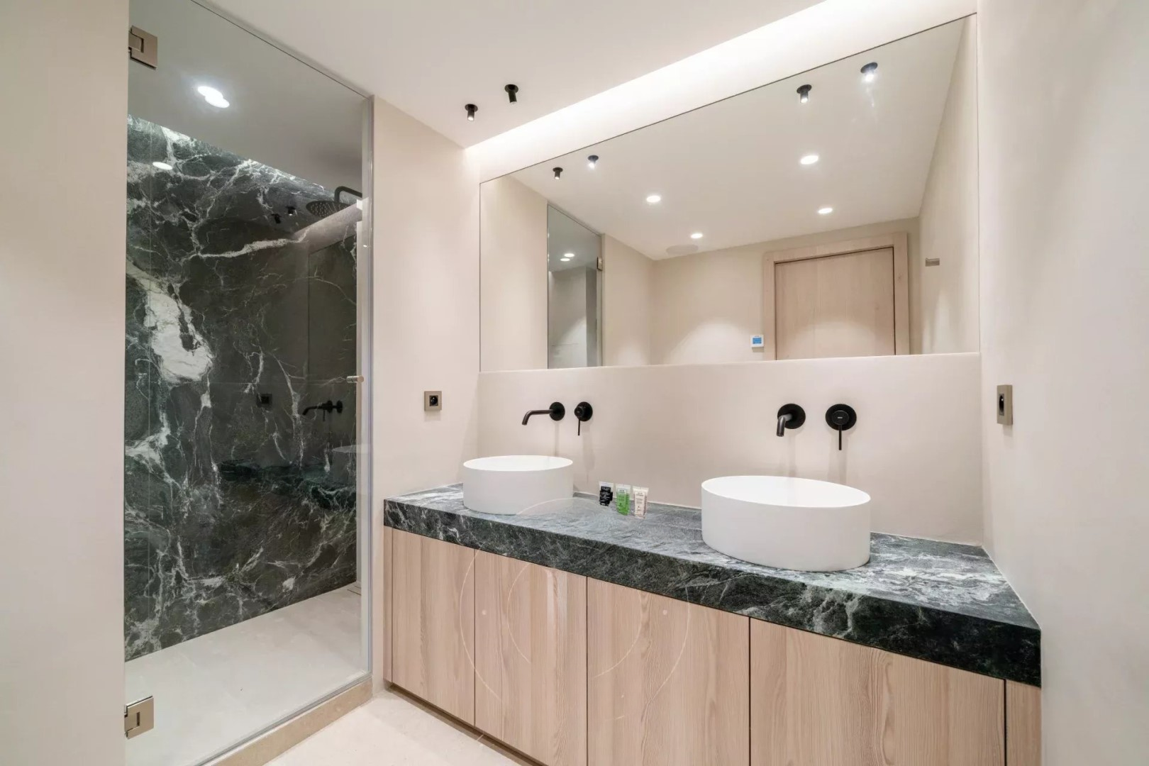 Жилая зона включает просторную светлую гостиную с открытой кухней, 3 спальни, одна из которых является мастер-спальней с собственной ванной комнатой; для двух других предусмотрена отдельная ванная комната.