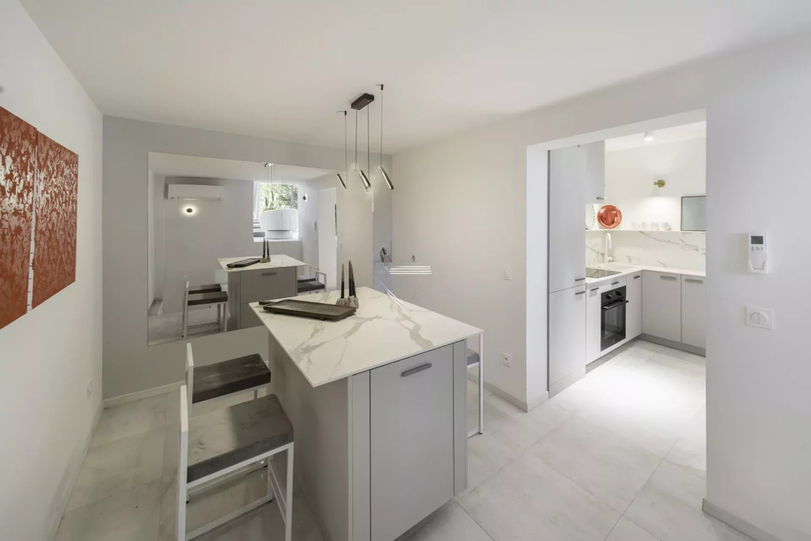 На цокольном этаже — просторная гостиная с камином, выход в приятный сад площадью около 50 м². Оборудованная открытая кухня с обеденной зоной.