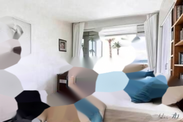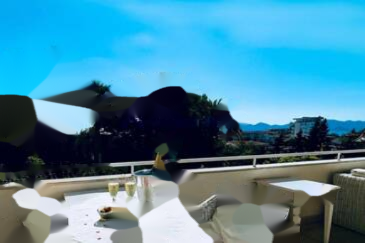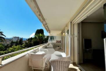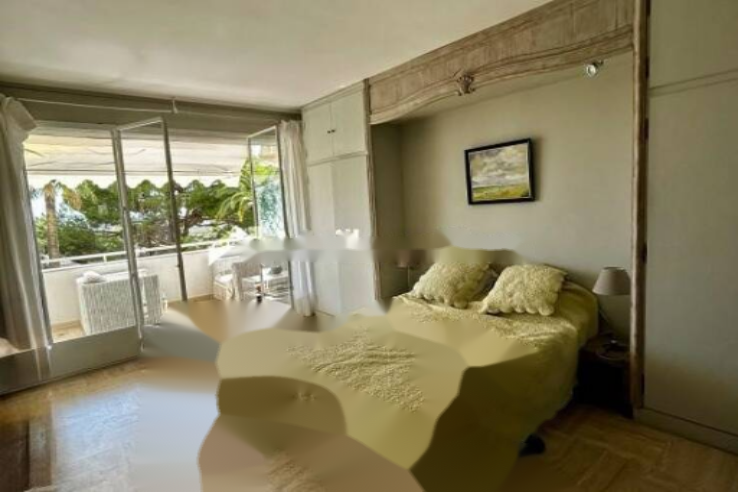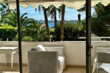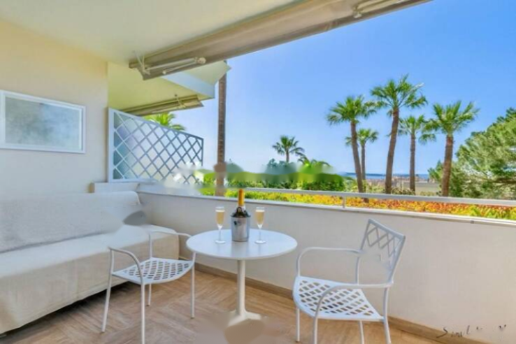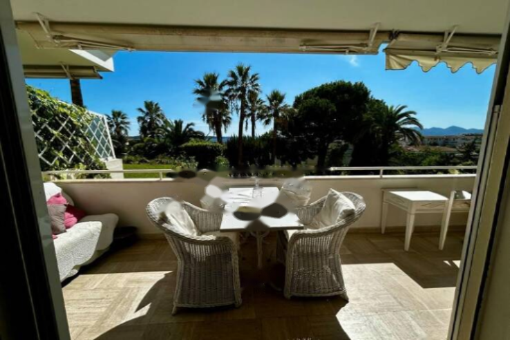 Квартира включает в себя прихожую и просторную светлую гостиную с открытой кухней, выходящей на террасу площадью 15 м² с видом на острова Лерин и горы Эстерель.