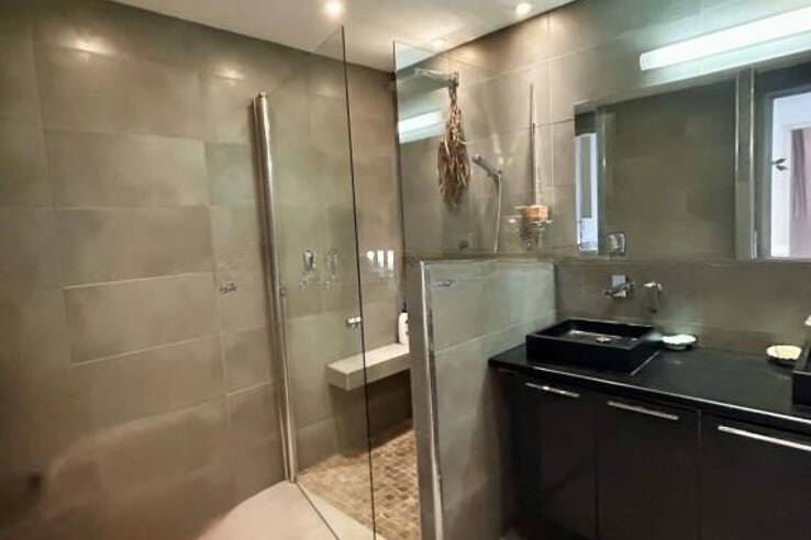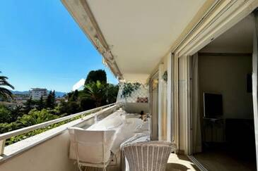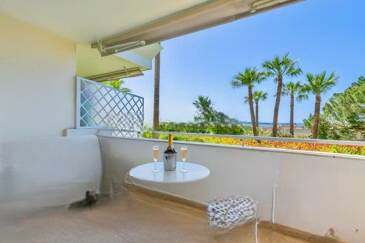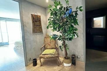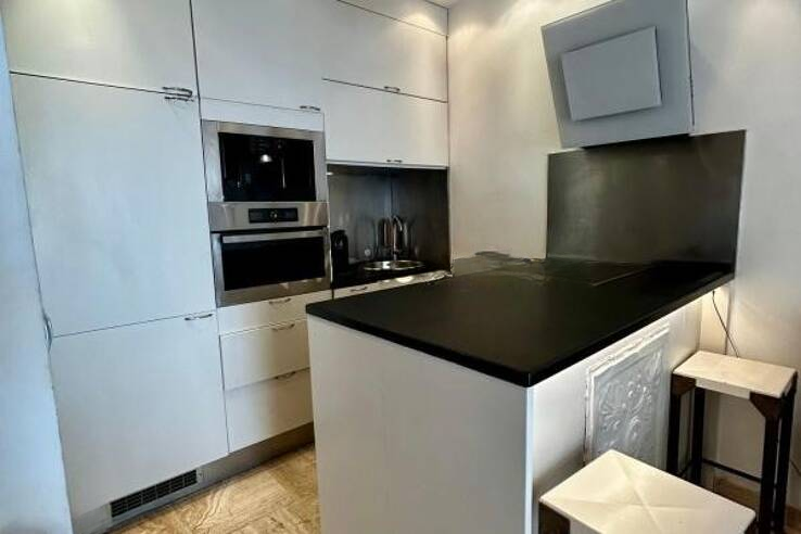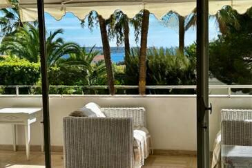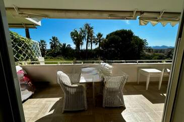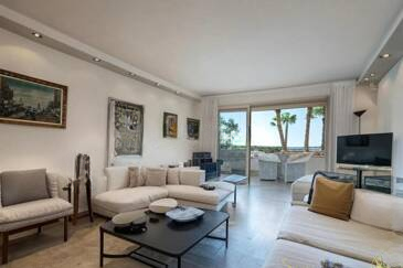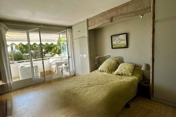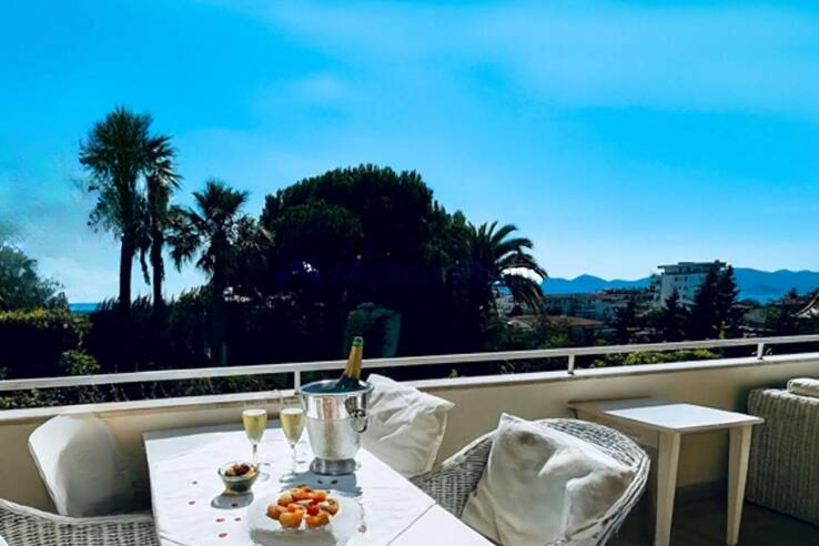 Квартира включает в себя входную зону, просторную и светлую гостиную с открытой кухней, выходящей на террасу в 15 м² с видом на Леринские острова и Эстерель.
