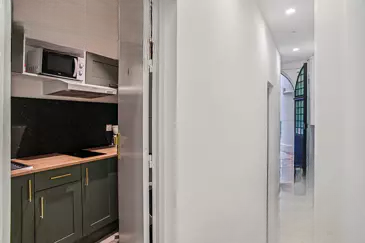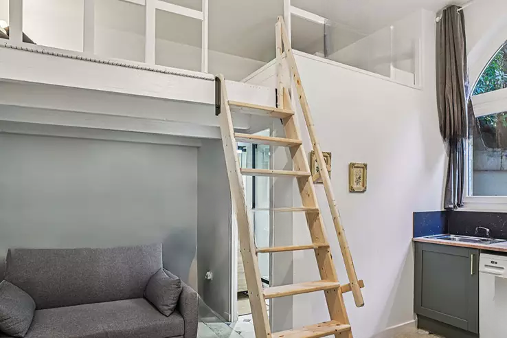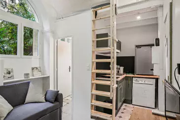 Расположенный на первом этаже с садом и с общим входом, этот объект обеспечивает уютную атмосферу, идеально подходящую как для сезонной, так и годовой аренды. Общая площадь 43,09 м² распределяется между тремя студиями: студия 1 — 12,83 м², студия 2 — 13,01 м² и студия 3 — 17,25 м². Высота потолков около 4 метров позволила оборудовать спальные зоны на антресолях, что существенно увеличило объем пространства и обеспечило оптимальный комфорт.