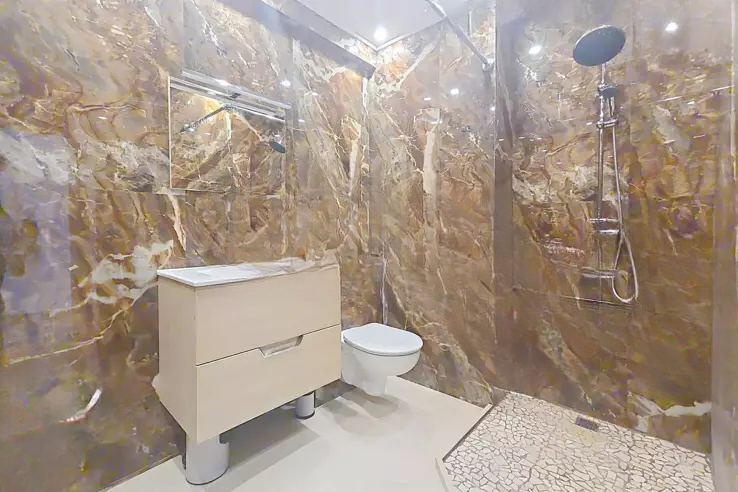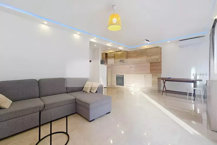 Пространство включает в себя просторную гостиную с оборудованной открытой кухней, идеальной для общения, две элегантные спальни, современную ванную комнату, два туалета и большую гардеробную.