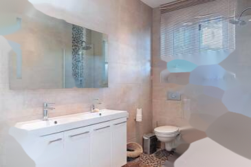 На верхнем этаже: 3 спальни, в том числе люкс с ванной/душем и туалетом, ванная комната с туалетом и глубокая терраса. Две спальни выходят на террасу, ориентированную на юг, с видом на море.