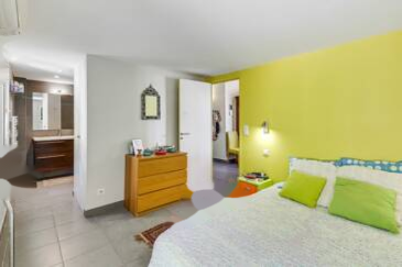 С общей площадью 74 м² (60 м² по закону Каррез), проходная квартира предлагает просторные помещения. На основном этаже находится гостиная с «кафедральным» потолком и умными шкафами под мансардой, оборудованная открытая кухня, спальня с собственным санузлом и отдельный туалет. Вторая спальня, расположенная в дуплексе с душевой, элегантно возвышается над жилым пространством и открывает панорамный вид на море.