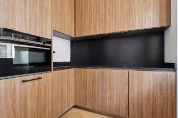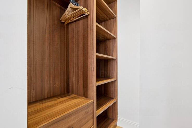 Гостиная с тремя большими окнами, обеспечивающими великолепное естественное освещение. Она оборудована встроенной кухней с множеством мест для хранения. Пространство для спальни умно оснащено полками с разъемами и примыкает к идеально устроенному гардеробу.