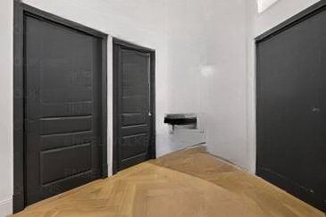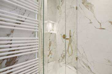 Ванная комната очень изысканная. Мрамор используется от пола до итальянского душа, а раковина, выдолбленная из цельного куска, добавляет изысканности этому месту, также оборудованному туалетом. Молдинги, обрамления, паркетная укладка "елочка", мрамор и большая высота под потолком придают месту вечный шарм. Кондиционер и качественное двойное остекление добавляют престижности этому месту.