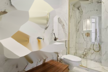 Ванная комната выполнена с высоким уровнем изысканности. Мрамор используется от пола до душа, а каменная раковина добавляет элегантности. В комнате также имеются туалеты.