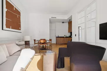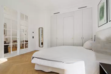 Элегантная старинная двойная дверь в стиле XIX века ведёт в спальню и продолжает жилую зону. Солнце освещает комнату и прилегающий уголок для работы, который имеет доступ к балкону.