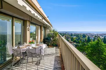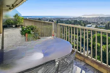 Расположенный в Каннах, в престижной резиденции с консьержем и охраной 24/7, ландшафтным парком, бассейном и теннисным кортом, очень красивая семейная квартира общей площадью 141 м². Находясь на предпоследнем этаже, она предлагает исключительную панораму на море, бухту Канн и холмы Эстерель.