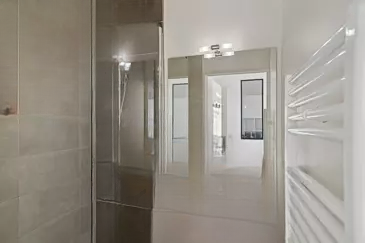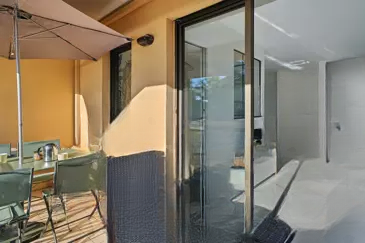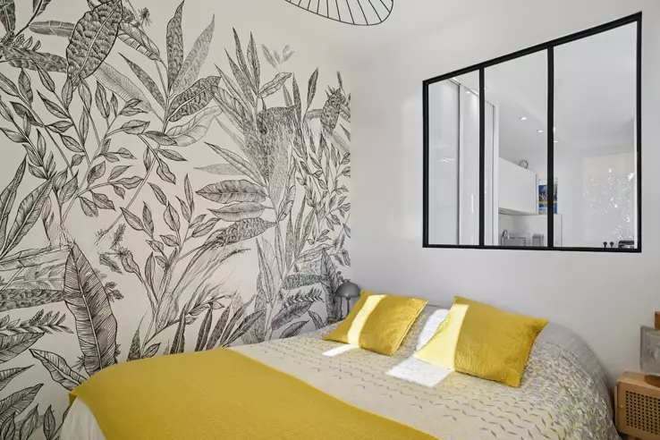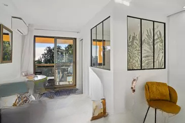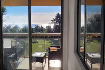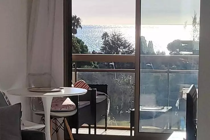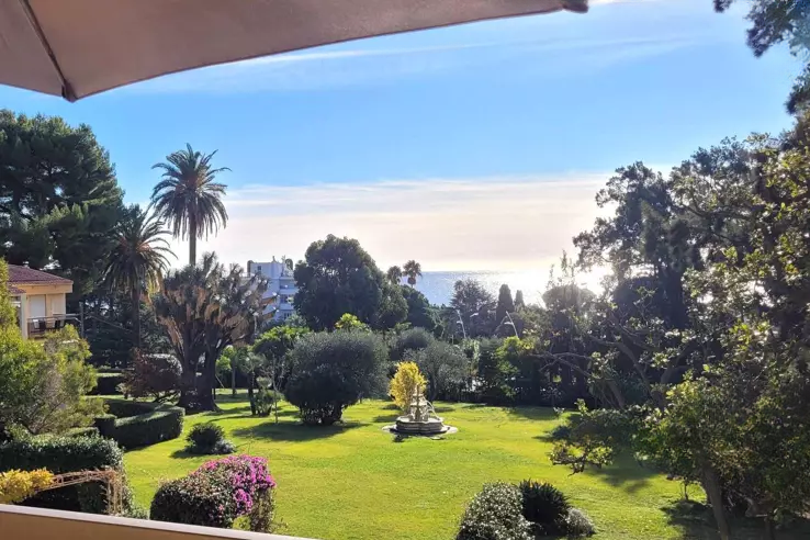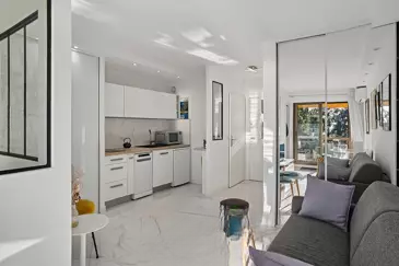 Функциональная планировка квартиры оптимизирована: прихожая ведет в ванную комнату с ультратонким поддоном, отдельный гостевой туалет, гостиную с открытой кухней и спальню в алькове с прекрасным видом на море и сад. ️ Квартира была полностью обновлена её жильцами и готова к использованию.