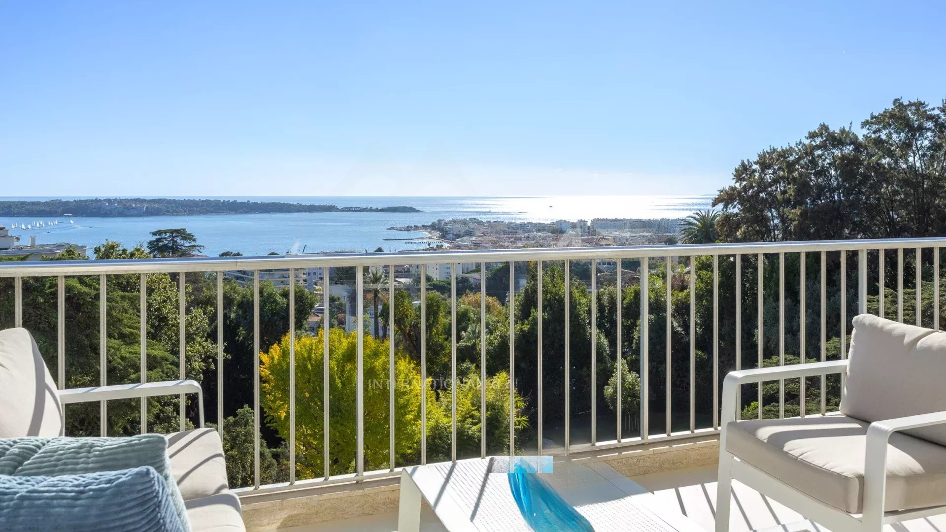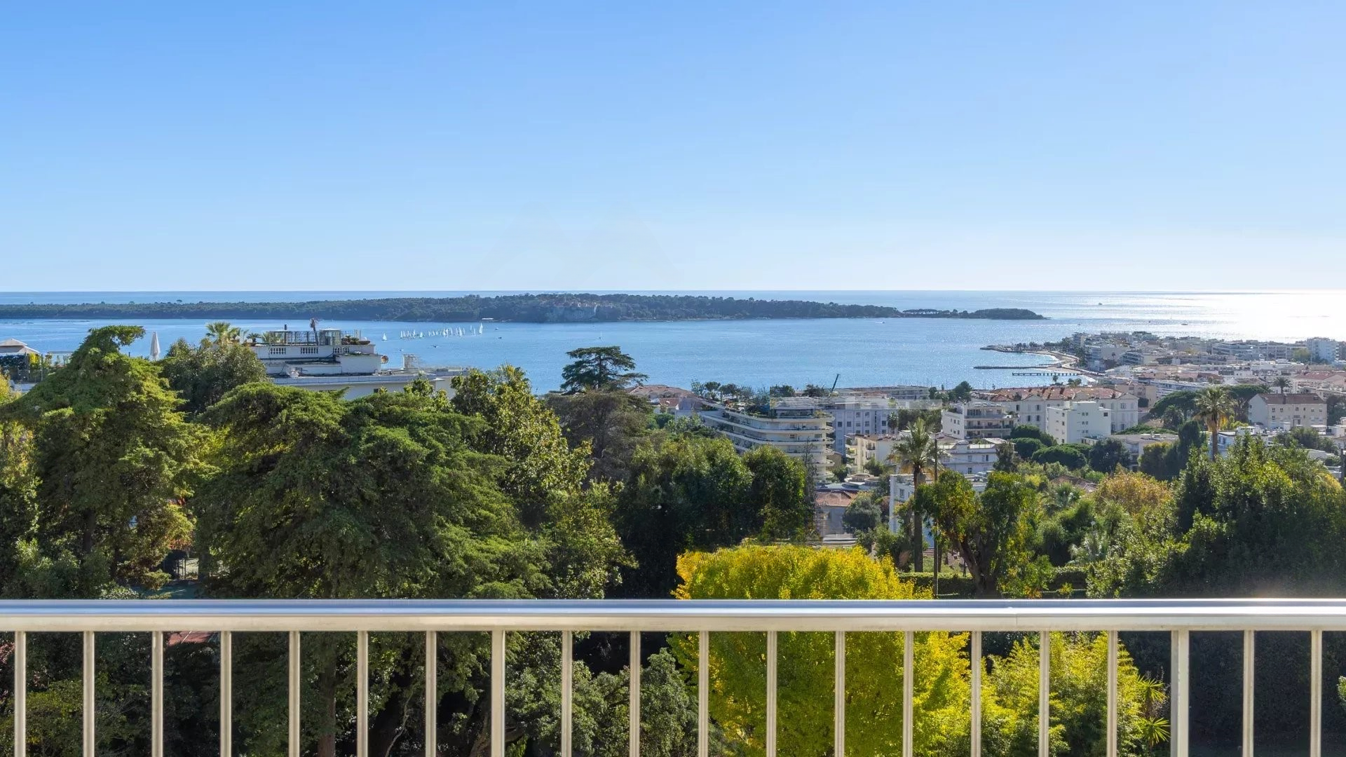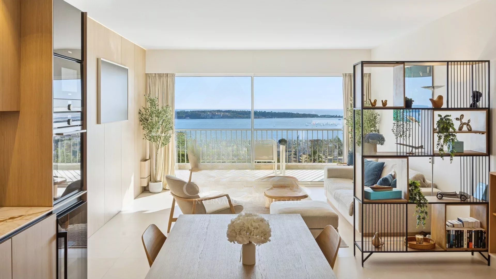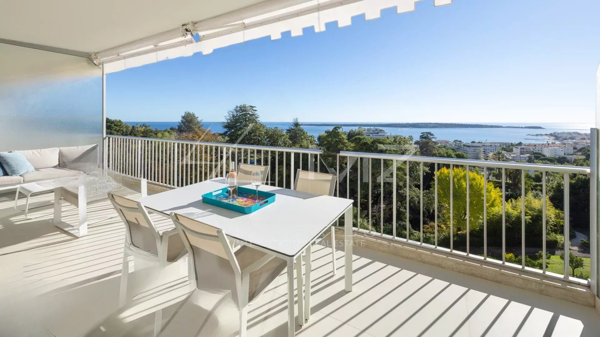 Квартира располагает светлым салоном, который выходит на террасу с захватывающим панорамным видом на Средиземное море и острова Лерин. Пространство отличает современный дизайн, прекрасно подходя для приемов или спокойного отдыха.