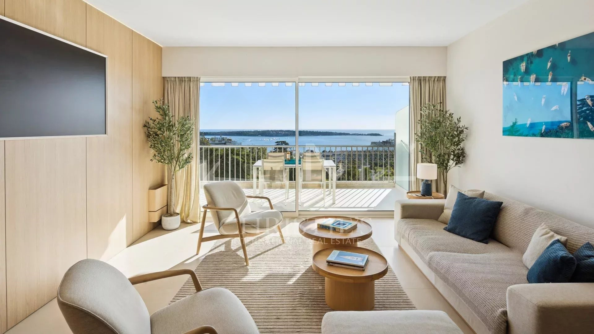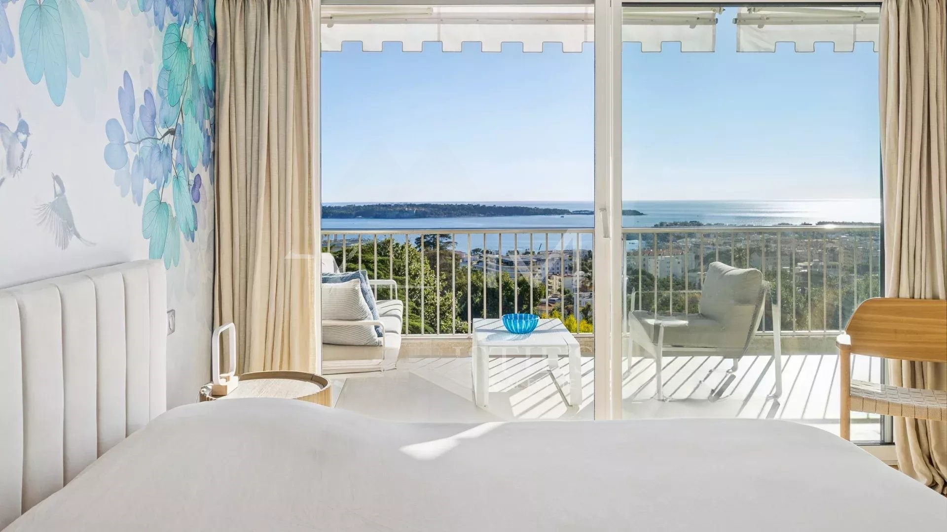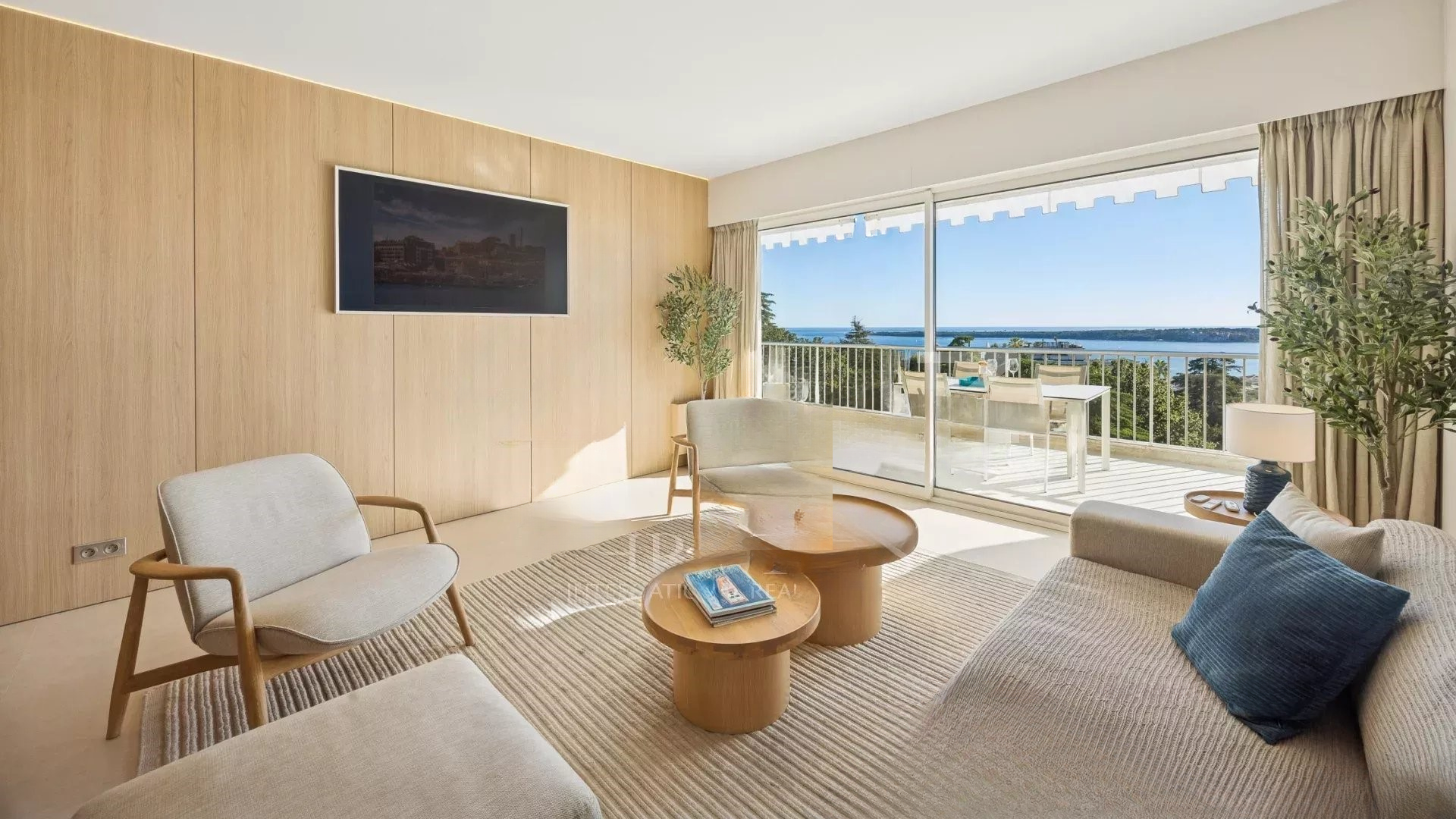 Квартира располагает светлым салоном, который выходит на террасу с захватывающим панорамным видом на Средиземное море и острова Лерин. Пространство отличает современный дизайн, прекрасно подходя для приемов или спокойного отдыха.