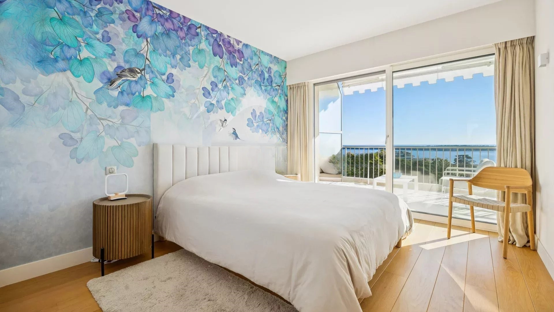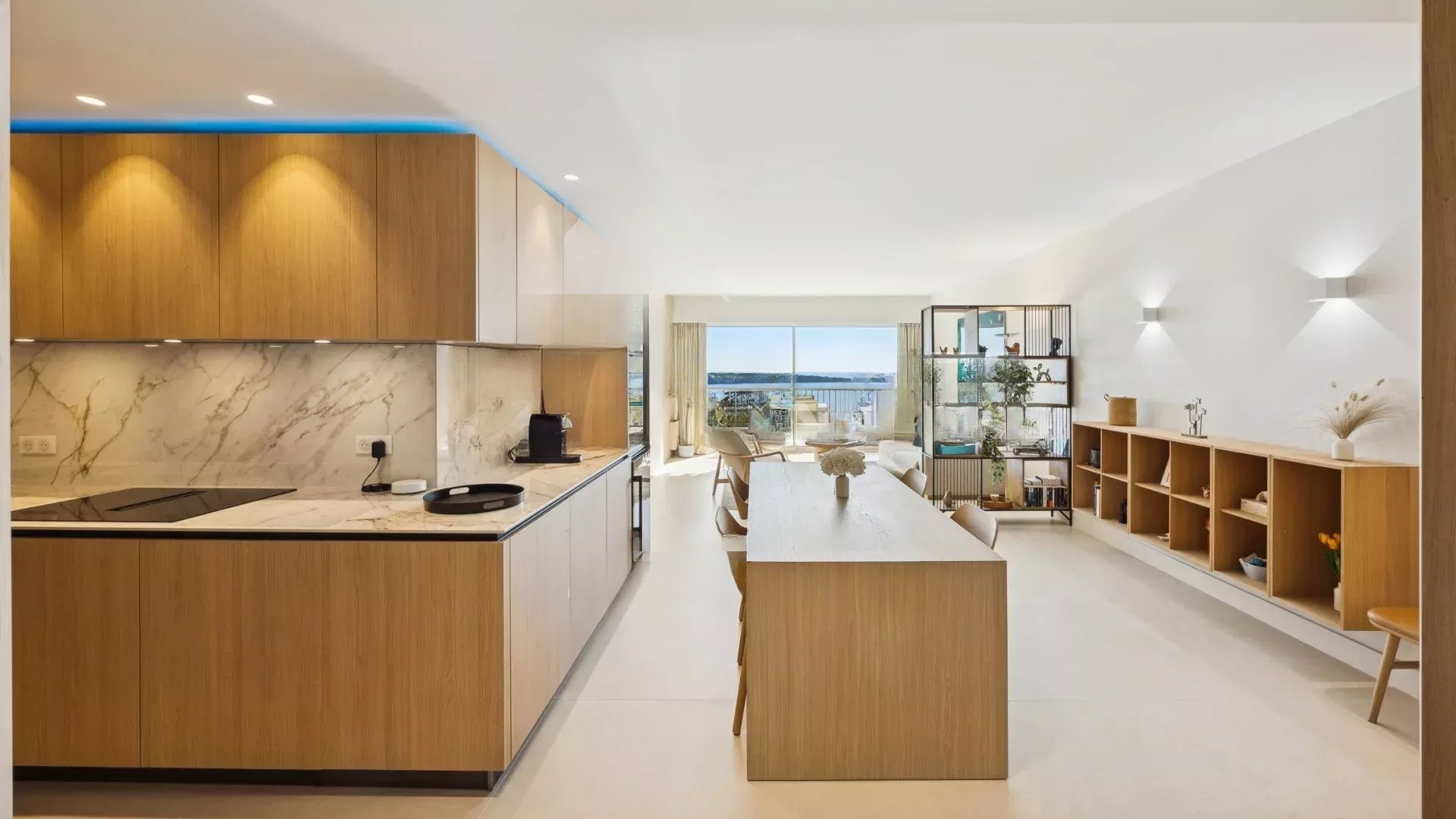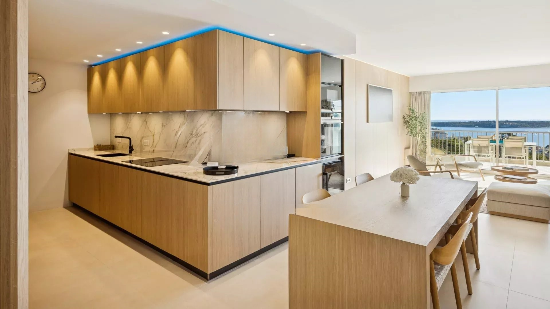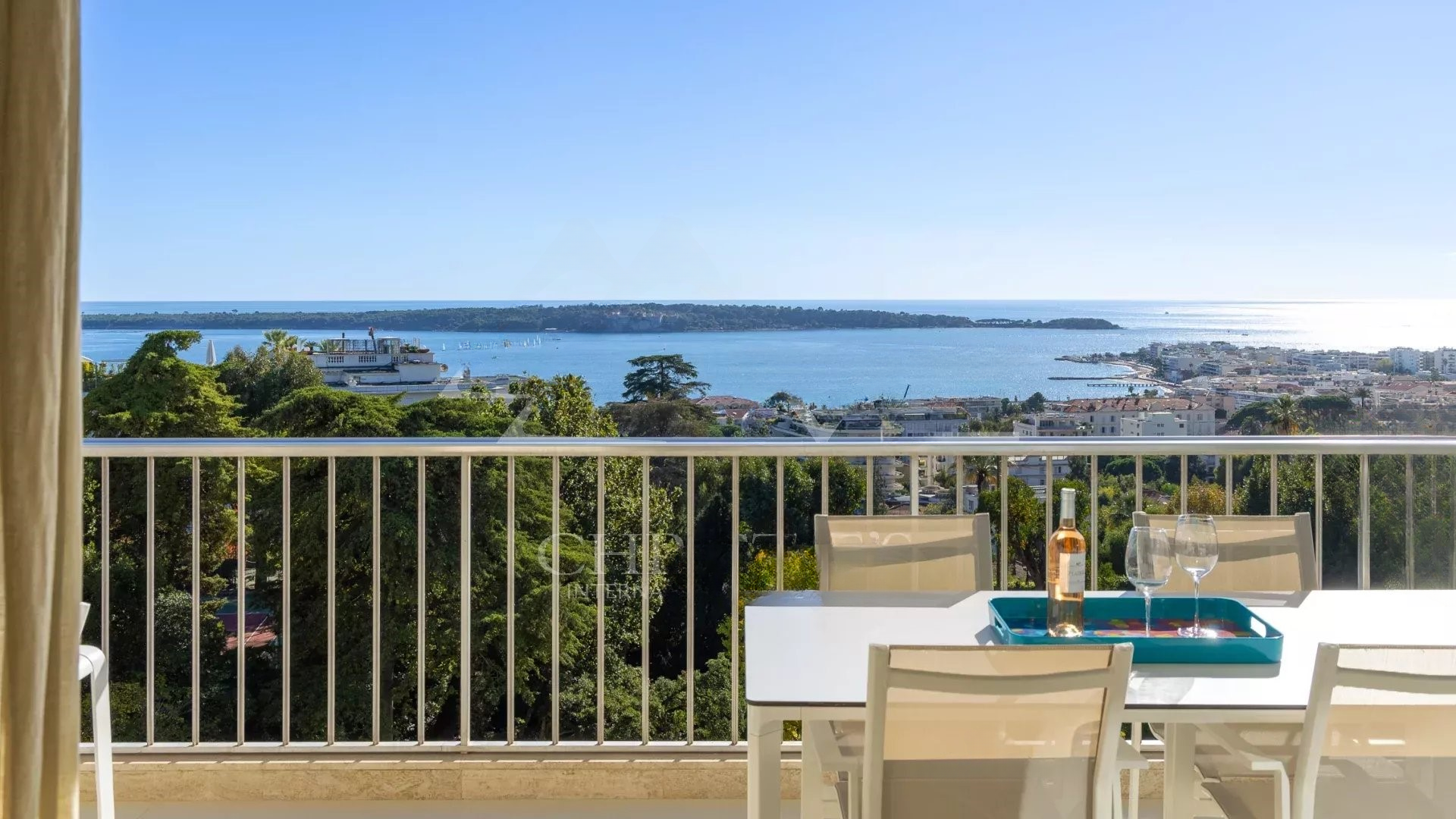Квартира располагает светлым салоном, который выходит на террасу с захватывающим панорамным видом на Средиземное море и острова Лерин. Пространство отличает современный дизайн, прекрасно подходя для приемов или спокойного отдыха.
