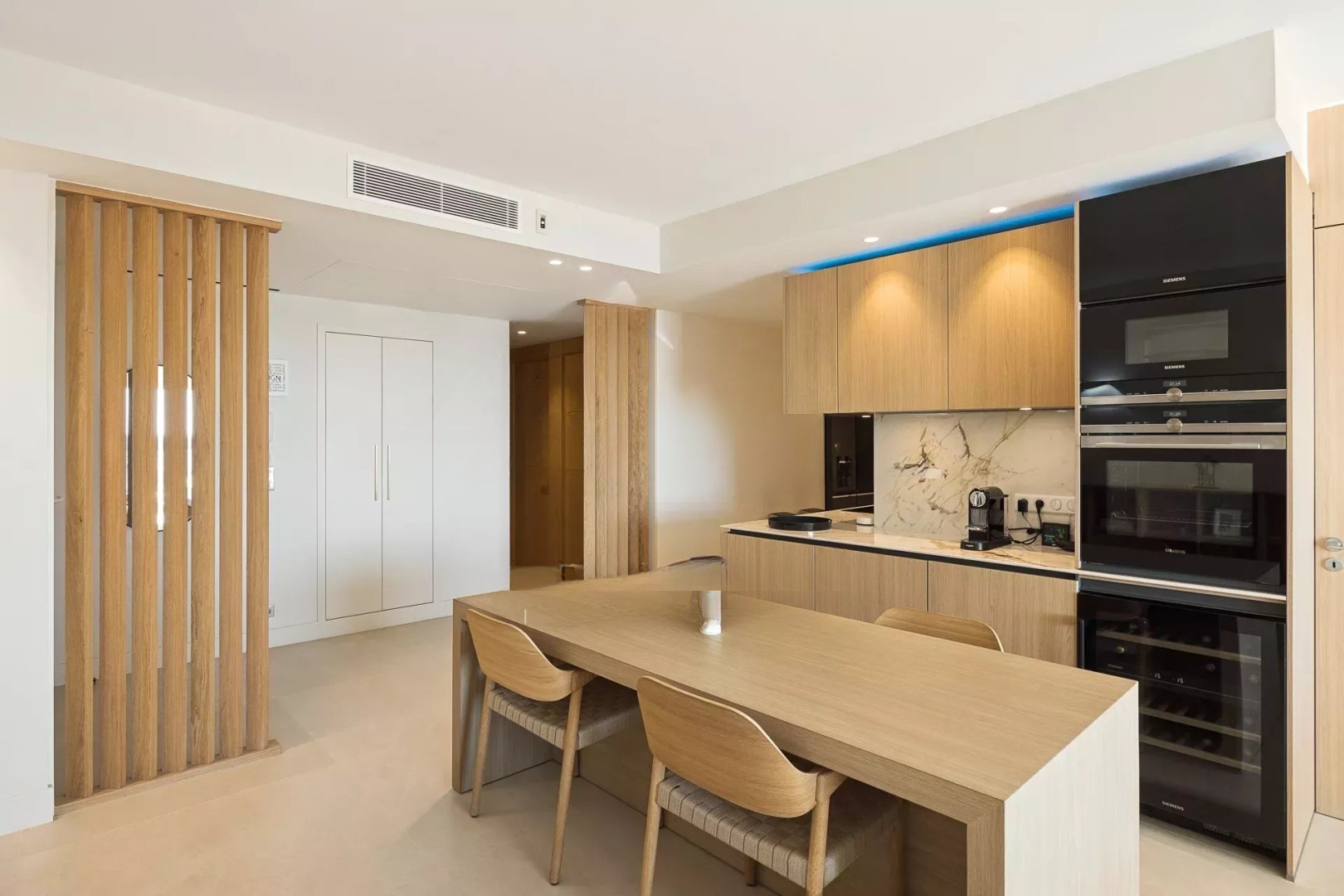 Открытая кухня, полностью оборудованная, сочетает функциональность и эстетику, создавая уютное пространство для любителей кулинарии. Здесь также находятся три просторные спальни, идеальные для размещения семьи и друзей, и две современные ванные комнаты, обеспечивающие роскошь и комфорт.