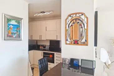 Она включает в себя прихожую, просторную гостиную со столовой и полностью оборудованной полусоединённой кухней, создающей уютное и элегантное жилое пространство.