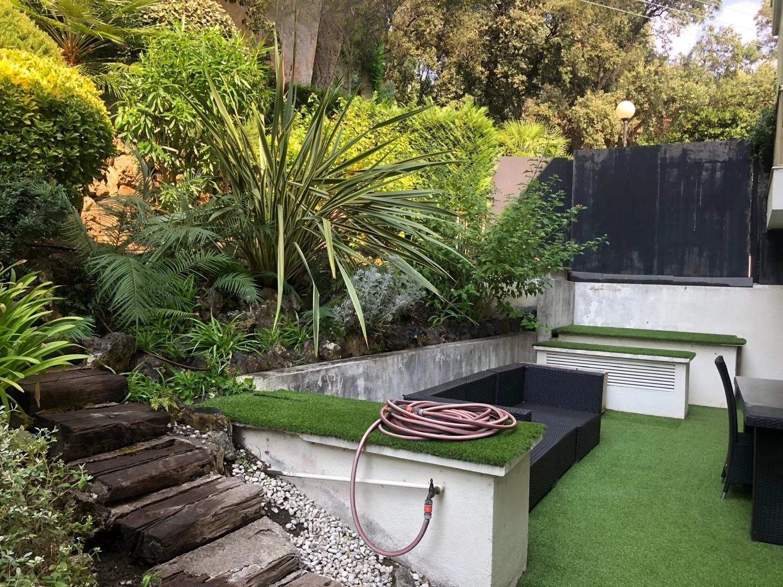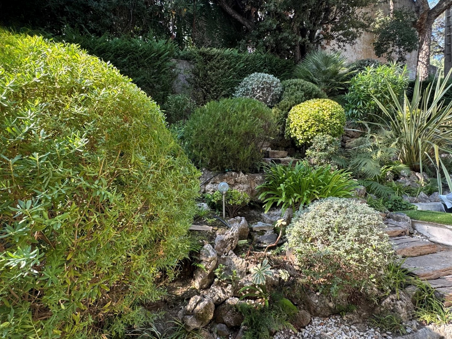 Гостиная, залитая светом, сочетается с современной открытой кухней, проектированной для комфортного приема гостей. Главная спальня имеет собственную ванную комнату и гардеробную, а вторая спальня в собственном крыле обеспечивает комфорт и уединенность. Обе спальни выходят на вторую террасу с прямым доступом в сад. Многие встроенные шкафы и прачечная в добавок. Общая площадь, полностью без видимых соседей и в отличном состоянии, была отремонтирована со вкусом.