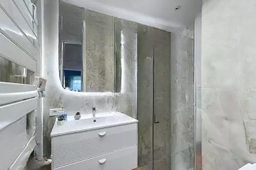 Квартира включает в себя просторную гостиную площадью 36 м², выходящую на террасу площадью 26 м², ориентированную на юго-запад, в абсолютной тишине. Имеется независимая оборудованная кухня с лоджией, две спальни, новая душевая комната, ванная комната с туалетом, а также отдельный туалет.