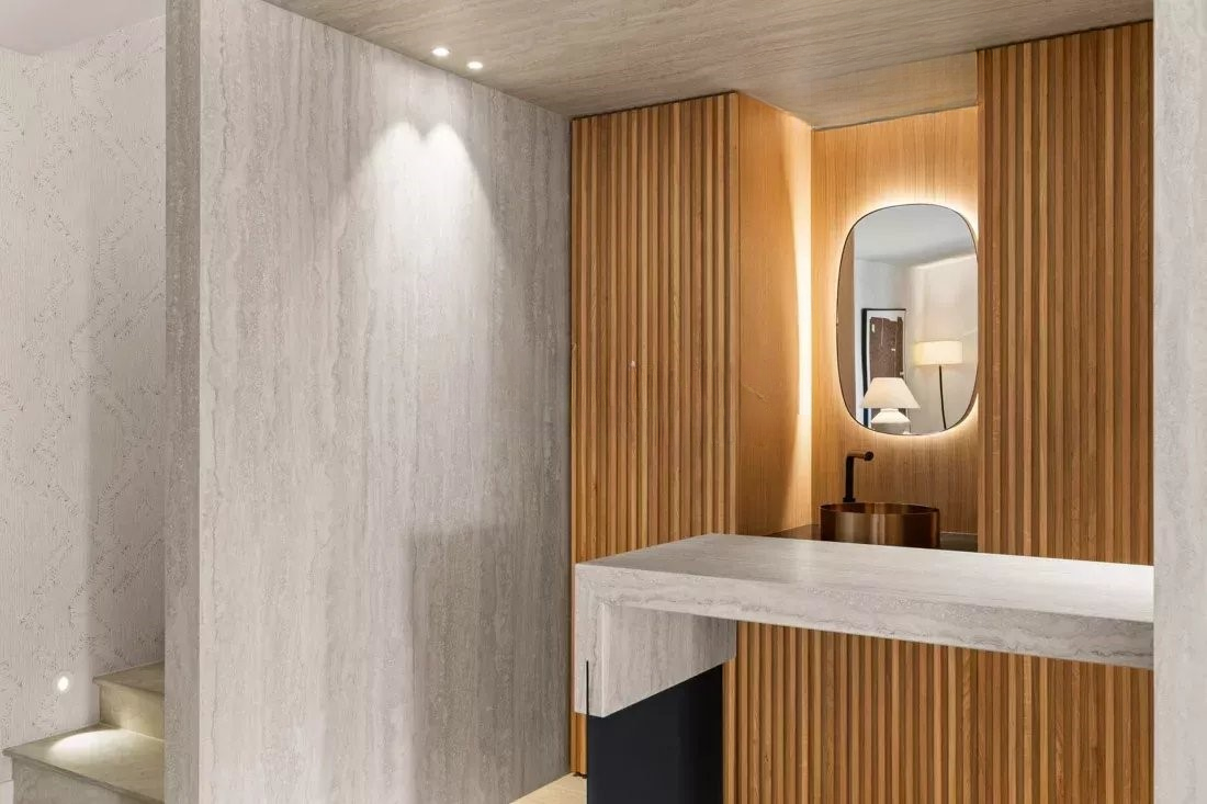 На площади в 315 м² расположена обширная зона для жизни, включающая в себя просторный салон, обеденную зону и элегантную открытую деревянную кухню. Роскошная основная спальня обладает собственной ванной комнатой. Всё это открывается на первую террасу, предоставляющую захватывающий вид.