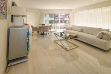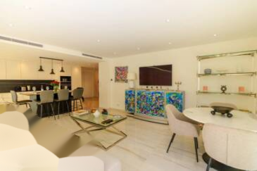 В престижной резиденции вы найдете этот великолепный полностью отремонтированный с изысканным вкусом и высококлассной отделкой апартамент. Входная зона ведет в великолепную угловую гостиную, наполненную светом благодаря трем большим панорамным окнам, которая плавно переходит в гостеприимную американскую кухню, обставленную и оборудованную.
