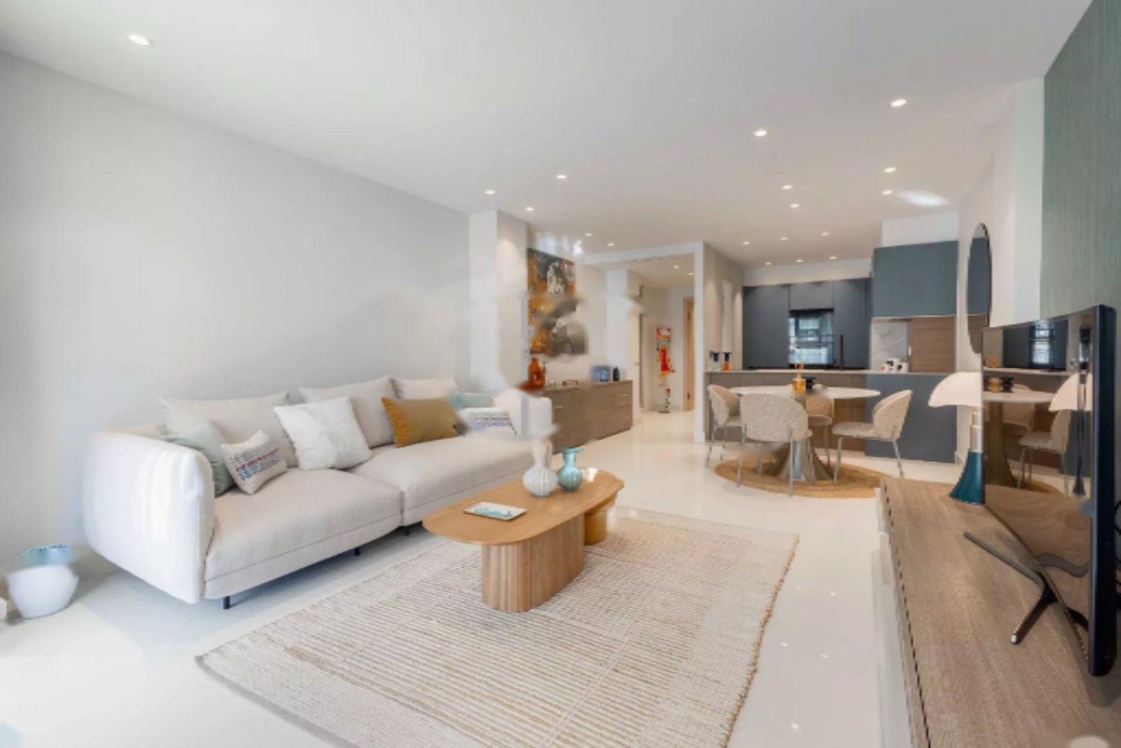 ✨ Впечатляющая новинка — великолепная квартира, полностью отремонтированная и стильно оформленная. Просторная входная зона с местом для хранения, 2 спальни, 2 душевые, светлая гостиная/столовая с уголком открытой оборудованной кухни и терраса с видом на ухоженный парк и море. Прекрасная терраса с южной экспозицией.