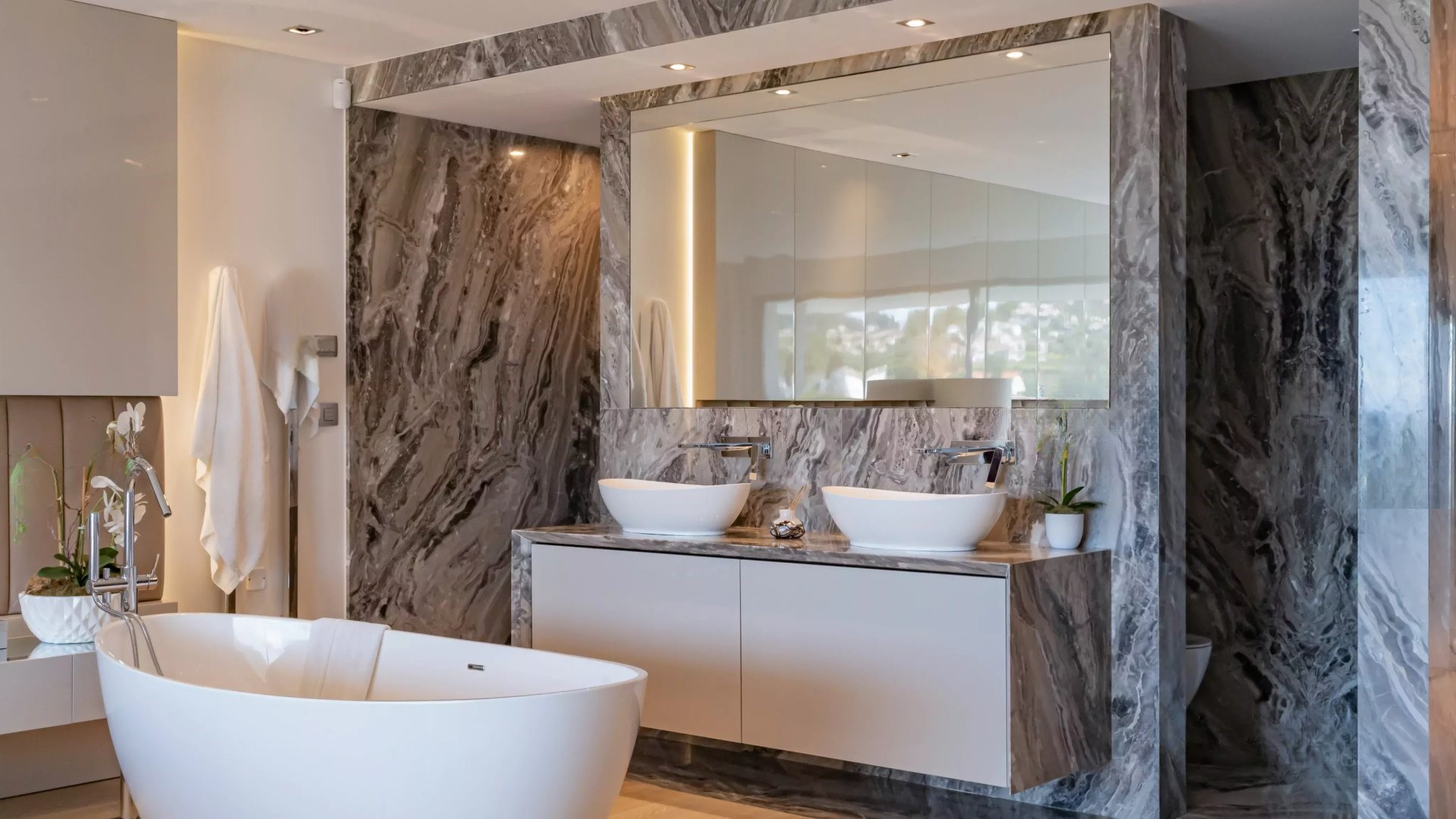 Четыре спальни, каждая с собственной ванной комнатой или душевой, туалетом и вместительными гардеробными, наслаждаются видом на море и также выходят на просторную террасу.