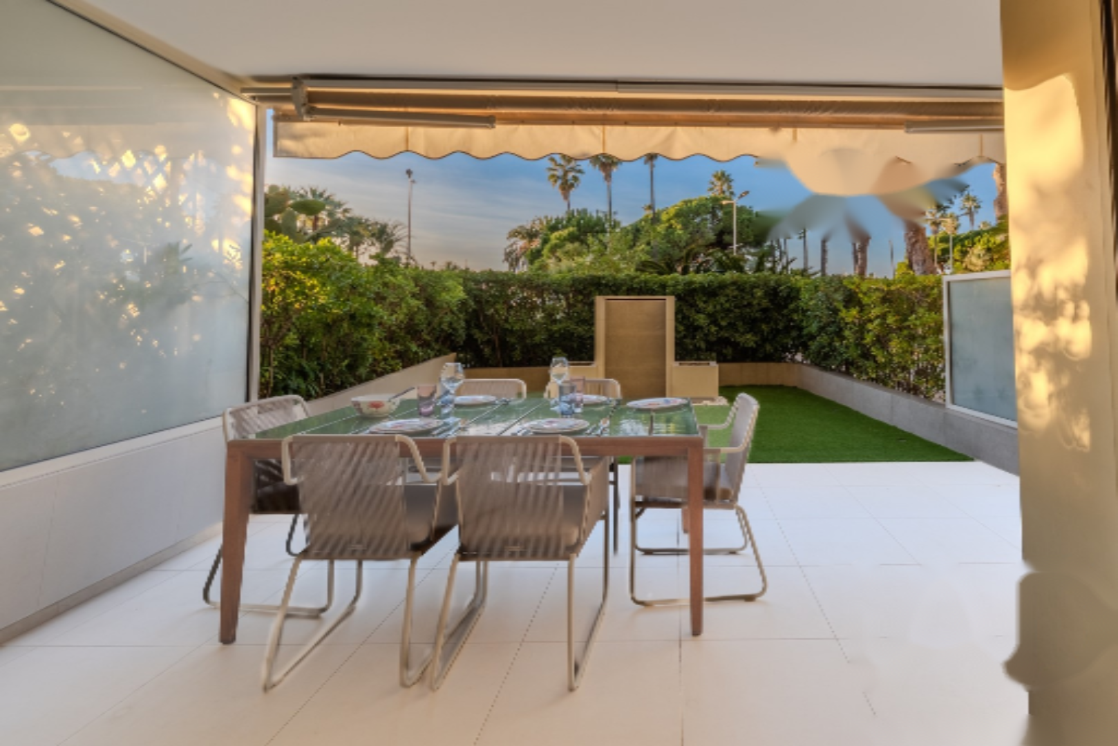 Ля-Пуант-Круазет — легендарное место, редкая жемчужина! В тихом уголке, напротив пляжей и порта Пальм-Бич, в престижной резиденции с садом, круглосуточной охраной и видеонаблюдением, расположен этот великолепный сквозной апартамент площадью 135 м². Он продолжен террасой в 20 м², погруженной в свет, и привлекает пространством, ясностью и высококлассной отделкой. Холл, жилая зона 60 м² с полностью оборудованной кухней премиум-класса, обеденная зона и гостиная, открытая на террасу с зеленью и видом на пальмы, две полные и изысканные спальни, прачечная, элегантный гостевой туалет. Подвал и гараж.