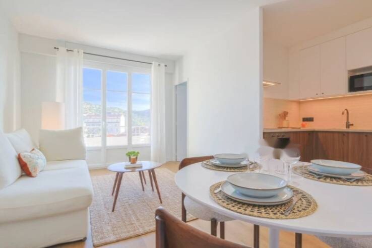 Квартира включает: оборудованную американскую кухню, гостиную с шкафами, террасу с видом на холмы Канн, спальню с кондиционером и встроенной душевой комнатой, отдельный туалет. Большой подвал площадью 6 м² дополняет этот объект.