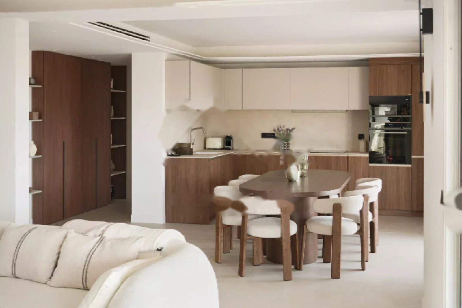 Открытая кухня, полностью оборудованная, также отражает современный стиль квартиры. Это уютное пространство идеально подходит для приготовления вкусных блюд с элегантностью.