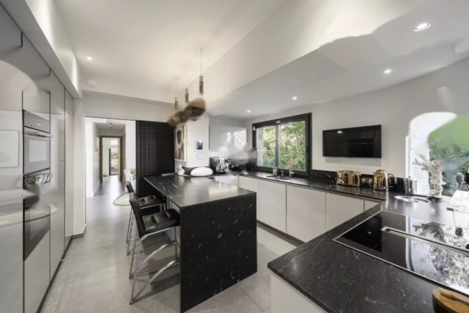 Общая жилая площадь около 280 м² открывает великолепные пространства, залитые светом, подчёркнутые двойной высотой потолков и панорамными окнами с видом на Средиземное море. Гостиные зоны — салон, столовая и полностью оборудованная современная кухня с центральным островом — плавно переходят на террасы и в сад, предлагая захватывающий вид на море, Кап д'Антиб и острова Лерин.