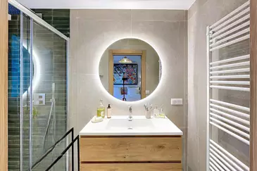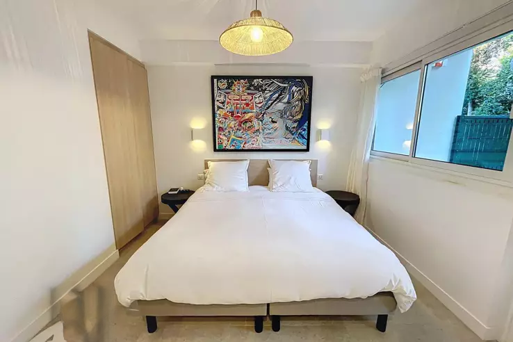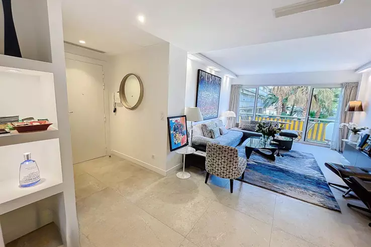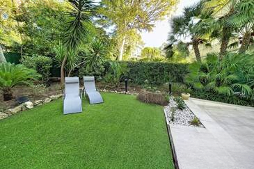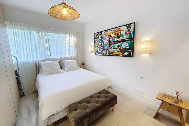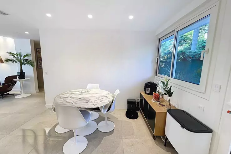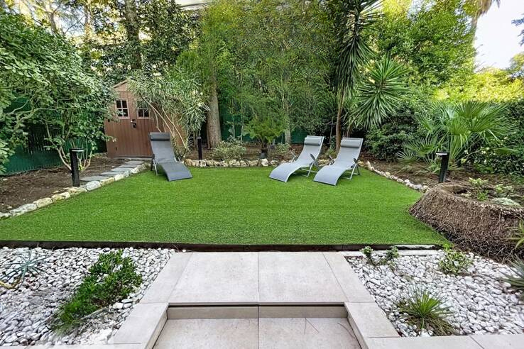 С общей площадью 74 м², квартира включает: просторный коридор с шкафами, гостиную, выходящую на южный балкон, большую кухню, оборудованную на север, которая ведет к прекрасному саду/террасе площадью около 200 м² с деревянным шале, спальню со шкафами на юг с душевой и туалетом, вторую спальню на север, выходящую в сад, с душевой, гостевой туалет и прачечную с шкафом.