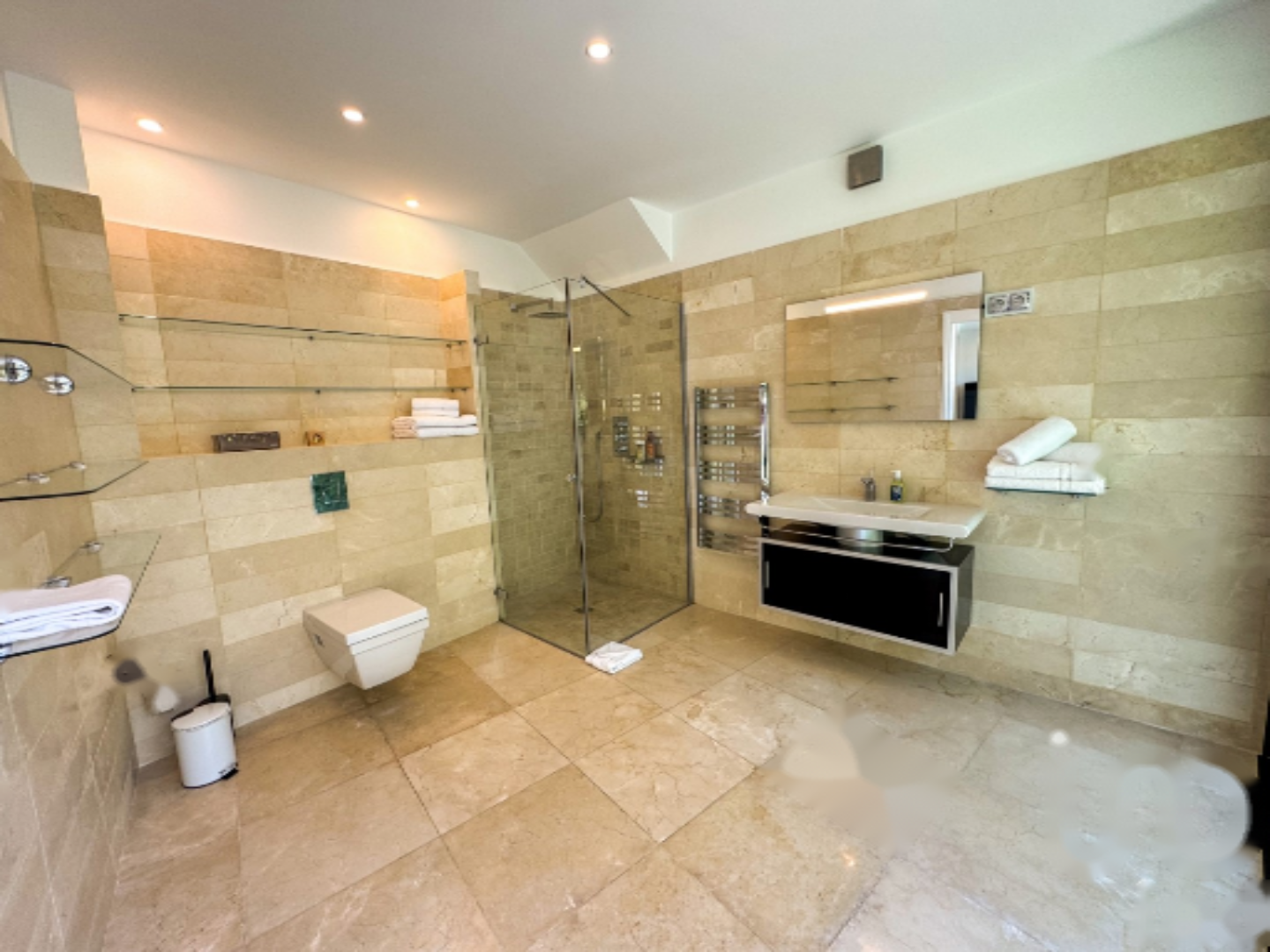 Вилла состоит из семи спален, каждая с собственной ванной комнатой и выходом на террасу. Просторные и светлые жилые помещения открыты наружу, с большой современной кухней, полностью совмещенной с гостиной, с прямым выходом на террасу и к бассейну.