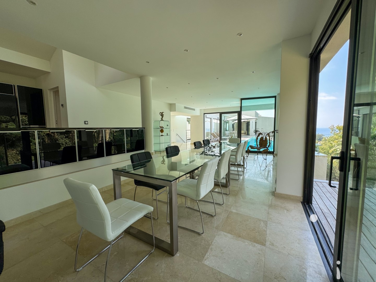 Вилла включает семь спальен, каждая из которых оборудована собственной ванной комнатой и имеет доступ к террасе. Светлые и просторные жилые зоны плавно переходят на улицу, имея прямой выход в современно оформленную кухню, связанную с гостиной, террасой и бассейном.