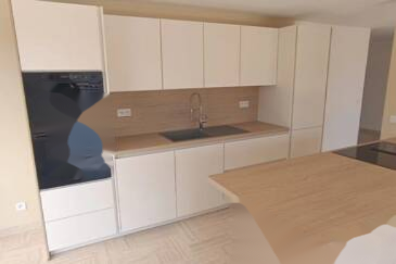 Жилая зона, включающая полностью оборудованную кухню (Whirpool, Elica), центральный остров общей площадью 42 кв. м, выходящая на просторную террасу площадью 10 кв. м с юго-западной экспозицией, а также балкон 4,5 кв. м.
