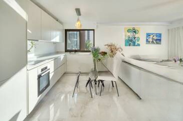Она состоит из прихожей, просторной светлой гостиной с кухней американского типа, выходящей на южную террасу площадью около 10 м², а также спальной комнаты с гардеробной и собственной душевой комнатой с туалетом.