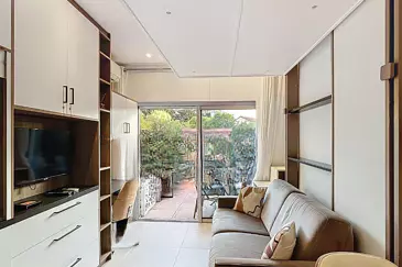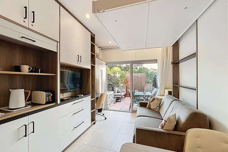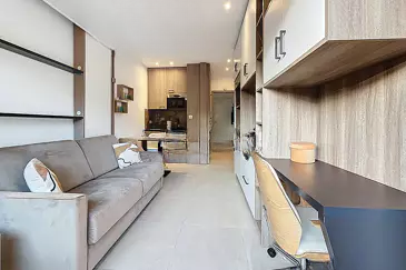 Студия была оформлена дизайнером интерьера, который использовал качественные материалы и обеспечил исключительную отделку. Просторное и светлое жилое пространство имеет выход на террасу, площадь которой составляет 12 кв.м. Современная ванная комната оборудована душем без поддона.