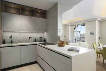 Квартира включает в себя жилую зону с открытой кухней, выходящую на приятную террасу с видом на море.