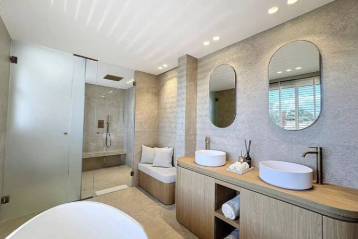 ️ Включает главную спальню с гардеробной и ванной комнатой, оснащенной душем и ванной, с террасой и панорамным видом на море, 2 спальни с ванными комнатами, одна из которых с собственной террасой. Квартира продается с 1 подвалом и 1 гаражом.