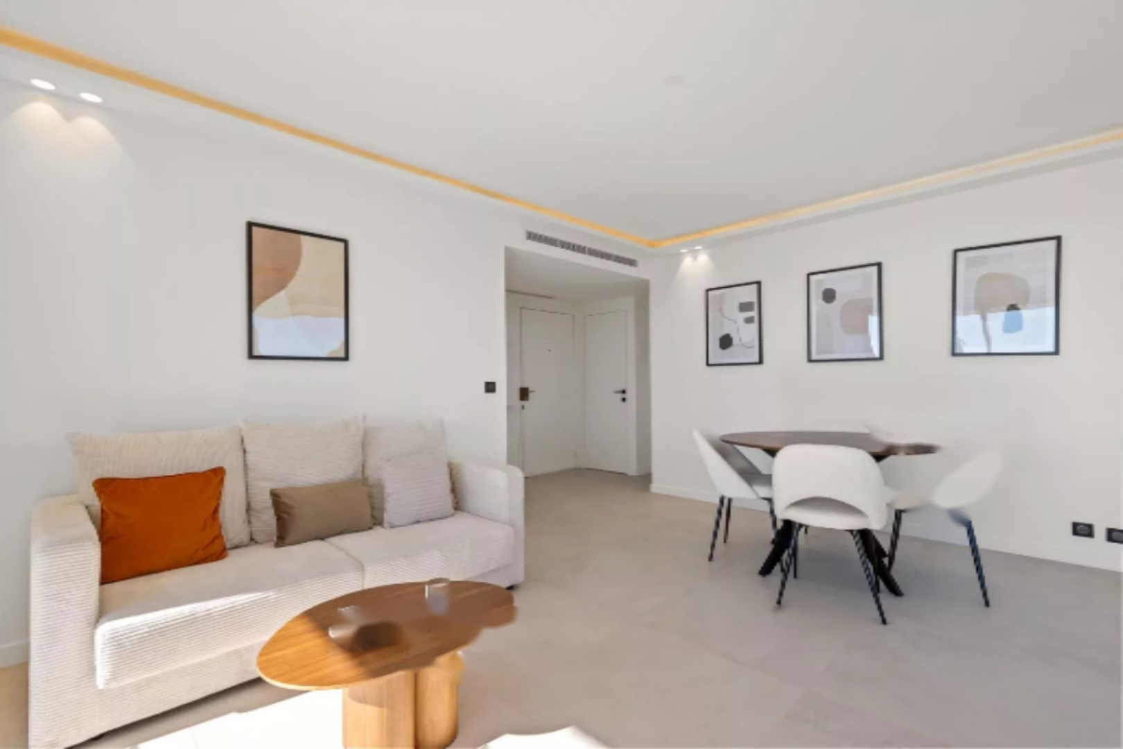 Состоит из входной зоны с шкафом, светлой гостиной с выходом на террасу, отдельной кухни, спальни с местом для хранения, ванной комнаты и гостевого туалета.